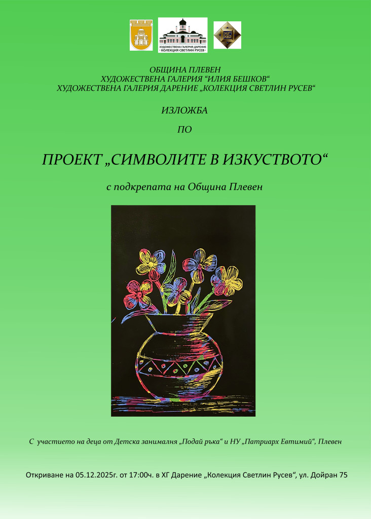 5 декември (петък) - Откриване на изложба с детски творби, реализирани по проекта „Символите в изкуството“ с ръководител Милена Петкова. Проектът се осъществява с финансовата подкрепа на Община Плевен и е част от културния календар. Откриване – 17.00 часа;