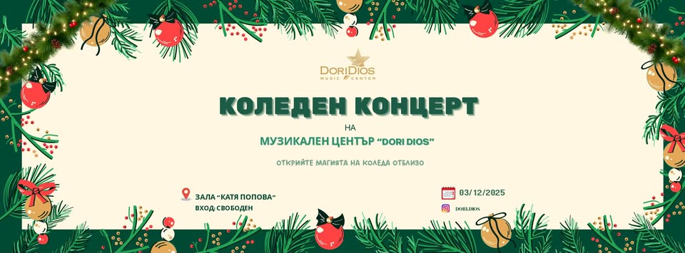 3 декември (сряда) - Коледен концерт с участието на учениците от музикален център „Dori Dios“ с преподаватели д-р Доротея Люцканова, Георги Чапанов и Марта Карамфилова. Очаква ви разнообразна програма с песни, инструментални изпълнения, много настроение, коледни емоции. Входът е свободен. Начало - 19.00 часа;