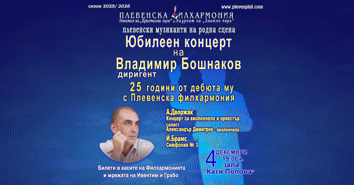 4 декември (четвъртък) - Плевенска филхармония кани на концерт от поредицата „Плевенски музиканти на родна сцена“ - юбилеен концерт на маестро Владимир Бошнаков и 25 години от дебюта му с Плевенска филхармония. Солист: Александър Димитров – виолончело. В програмата: А. Дворжак - Концерт за виолончело и оркестър, Й. Брамс - Симфония № 3. Начало - 19.00 часа;