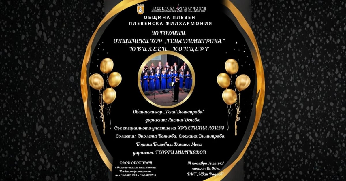 14 ноември (петък) - юбилеен концерт, посветен на 30 години от създаването на Общински хор „Гена Димитрова“ с диригент Анелия Дечева. Участват: Плевенска Филхармония, хор при Северняшки ансамбъл за народни песни и танци „Иван Вълев“ - Плевен. Диригент: Георги Милтиядов. Специален гост на събитието: Християна Лоизу. Солисти: Виолета Боянова, Снежана Димитрова, Боряна Бешева и Даниел Меса. Вход СВОБОДЕН с покани от Билетните центрове на Плевенска филхармония. Начало - 19.00 часа.