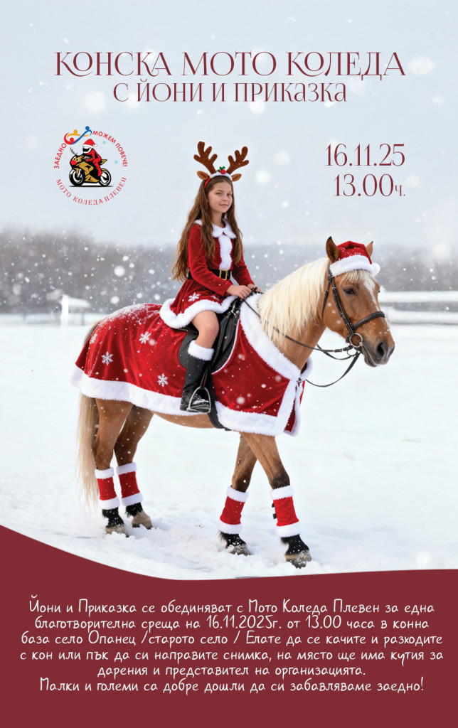 16 ноември (неделя) - Йони и Приказка се обединяват с Мото Коледа - Плевен за благотворителна приказка в конната база в с. Опанец (Старо село). Може да се качите и да се разходите с кон благотворително или да си направите снимка. На място ще има кутия за дарения, за да могат всички желаещи да станат съпричастни към каузата на Мото Коледа да помогнем на децата в нужда. Начало - 13.00 часа.