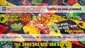 12 ноември (сряда) - „Есенни вдъхновения“ - творческа вечер с Дамски клуб „Фрея“ и Майя Ананиева. В ноемврийската творческа вечер ще има всичко - рисуване с текстилни бои и контури, правене на уникални отпечатъци и създаване на пана. Място - зала „Библиотеката“. Начало - 18.00 часа.