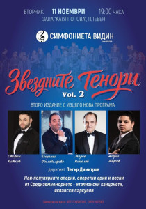 11 ноември (вторник) - „Звездните тенори“ Vol. 2 - Видинският симфоничен оркестър и великолепните тенори: Георгиос Филаделфевс (Гърция), Марио Николов, Стефан Петков и Андрея Мирчев (България), под диригентската палка на маестро Петър Димитров, ще представят второ издание с изцяло нова програма „The Star Tenors“. Любителите на музиката ще чуят най-популярните оперни и оперетни арии и песни от Средиземноморието - италиански канцонети, френски шансони, испански сарсуели. Начало - 19.00 часа;