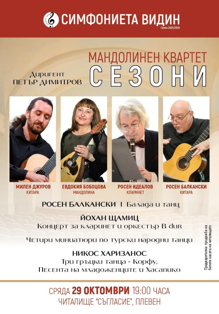 29 октомври (сряда) – концерт на Симфониета Видин и Мандолинен квартет „Сезони“. Ще чуете изпълненията на Милен Джуров – китара, Евдокия Бобоцова – мандолина, Росен Идеалов – кларинет, Росен Балкански – китара. Диригент – Петър Димитров. В програмата: Росен Балкански I – Балада и танц; Йохан Щамиц – концерт за кларинет и оркестър B dur; Четири миниатюри по турски народни танци; Никос Харизанос – Три гръцки танца – Корфу, Песента на младоженците и Хасапико. Място - зала „Емил Димитров“, начало - 19.00 часа.
