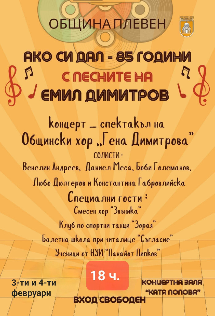 Поради големия интерес и желанието на стотици плевенчани да присъстват на концерт-спектакъла по повод 85 години от рождението на знаменития ни съгражданин Емил Димитров, Община Плевен обявява нови две дати за представяне на спектакъла. Концертите са на 3 и 4 февруари (вторник и сряда) от 18,00 часа в зала „Катя Попова“. Входът отново е с безплатни покани, които ще се раздават от 19 януари (понеделник) във фоайето на зала „Катя Попова“ всеки работен ден от 10.00 до 17.00 часа до изчерпване на местата в залата!