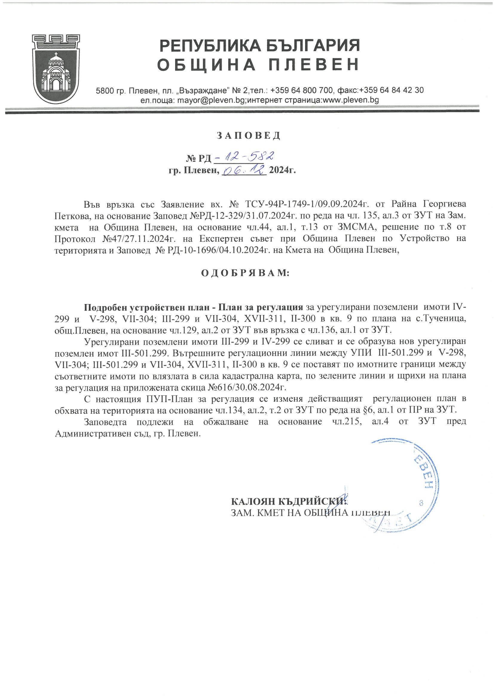 Община Плевен, на основание чл.129, ал.2 от Закона за устройство на територията съобщава, че със заповед № РД-12-582/06.12.2024 г. на Зам. кмет на Община Плевен е одобрен проект за изменение на: