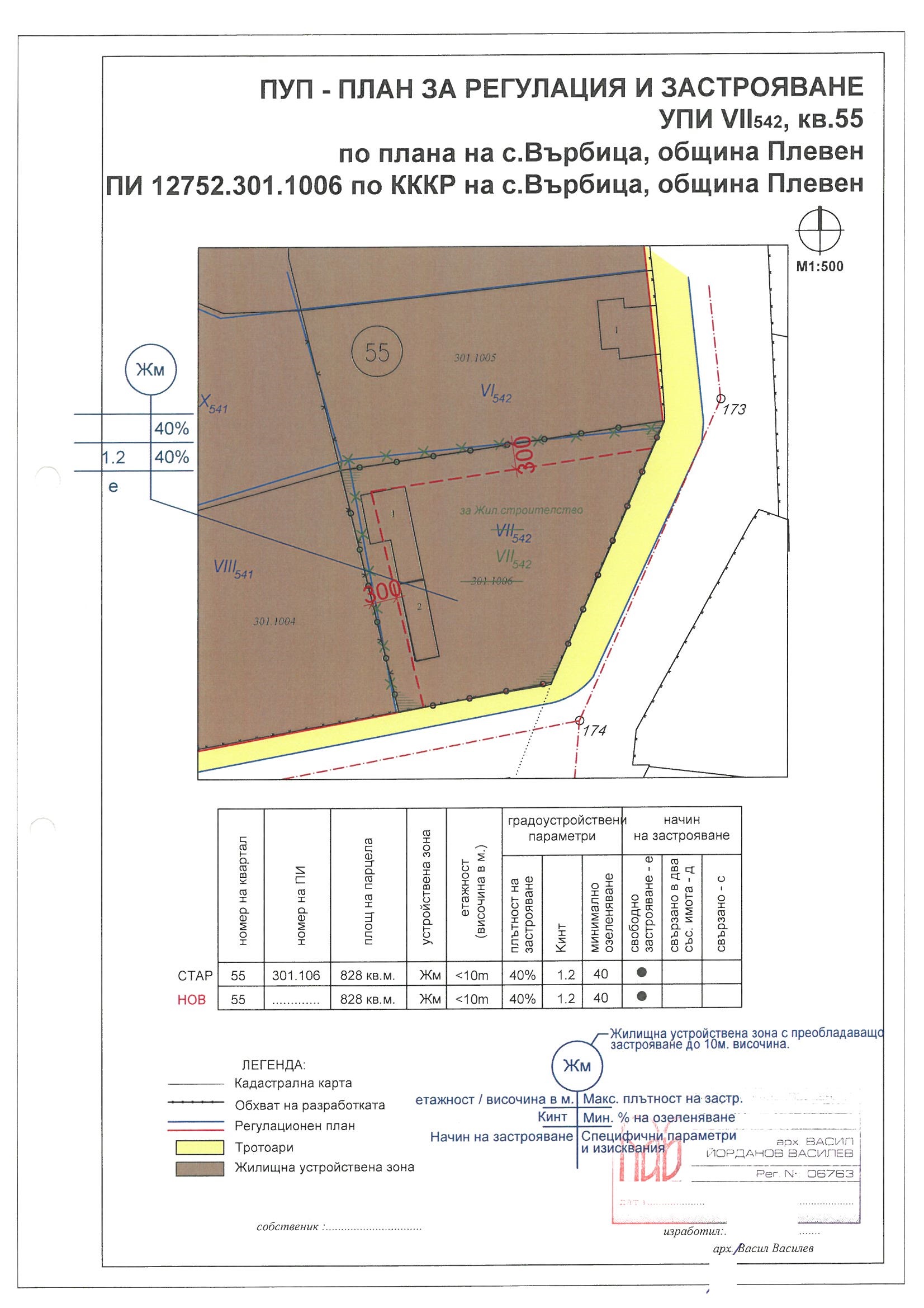 Изменение на Подробен устройствен план - План за регулация и застрояване за урегулирани поземлени имоти VII-542, VIII-541 и VI-542 в кв. 55 по плана на с. Върбица, общ. Плевен.
