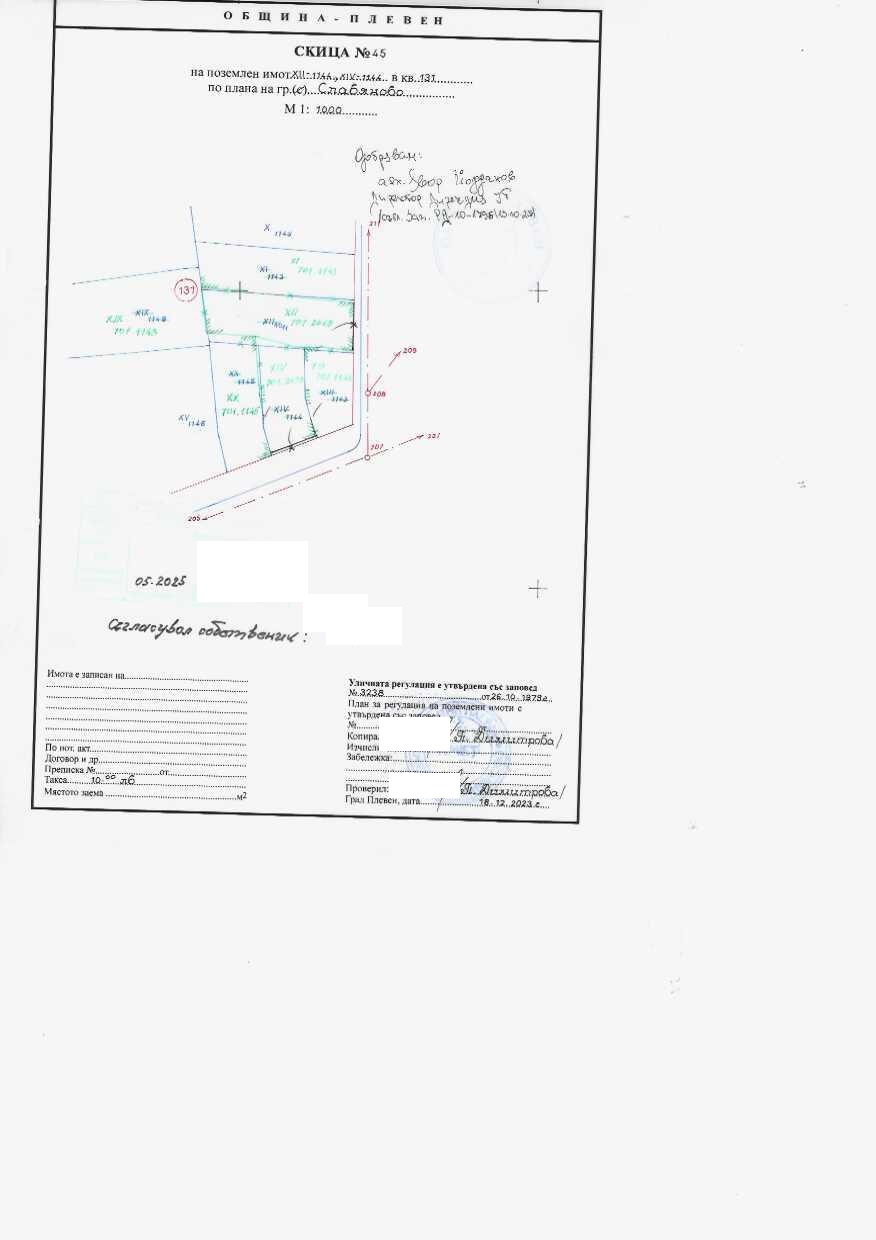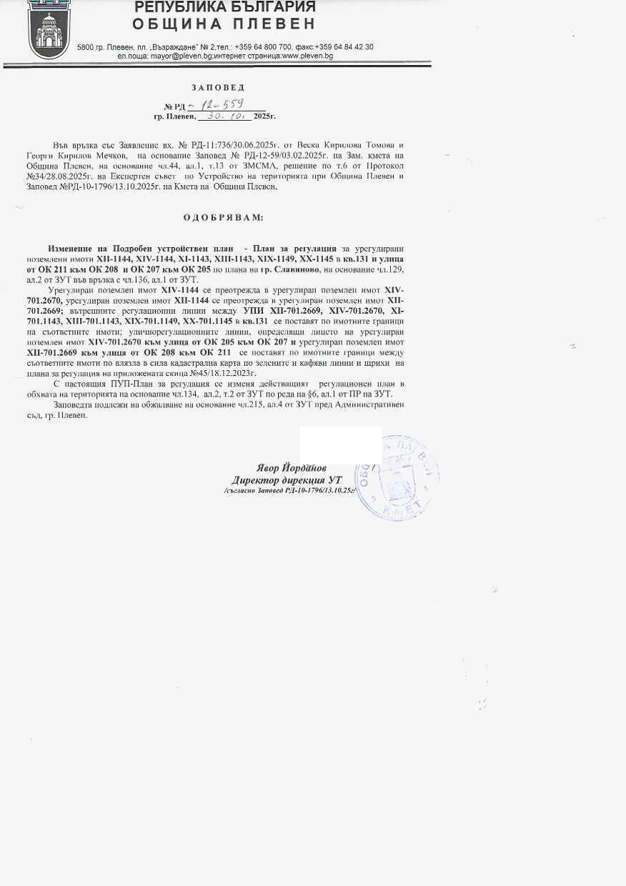 Община Плевен, на основание чл.129, ал.2 от Закона за устройство на територията съобщава, че със заповед № РД-12-559/30.10.2025 г. на Директор дирекция „УТ“ при Община Плевен е одобрен проект за изменение на: