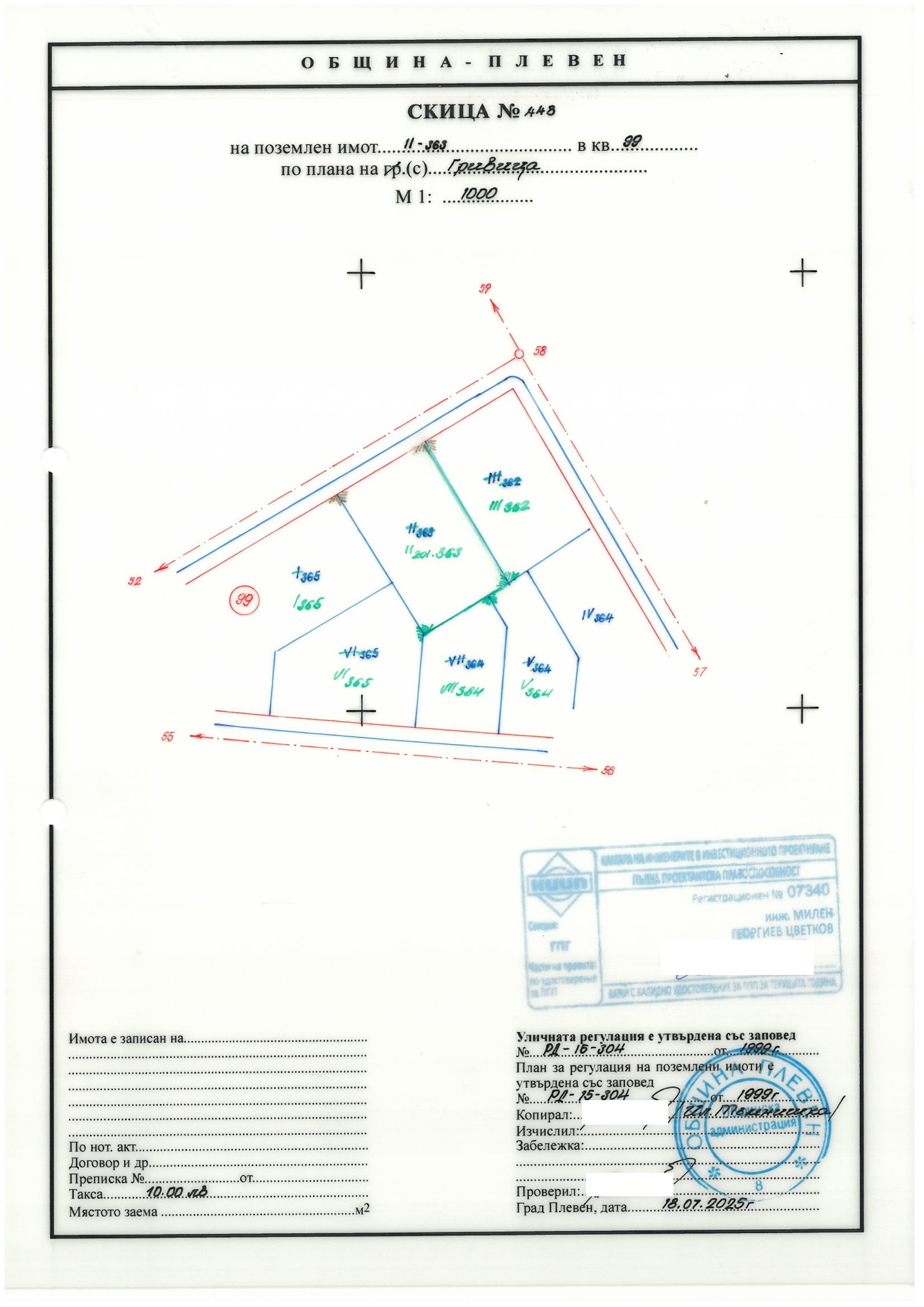 Изменение на Подробен устройствен план - План за регулация за урегулирани поземлени имоти II-363 и III-362, V-364, VII-364, VI-365, I-365 в кв. 99 по плана на с. Гривица, общ. Плевен.