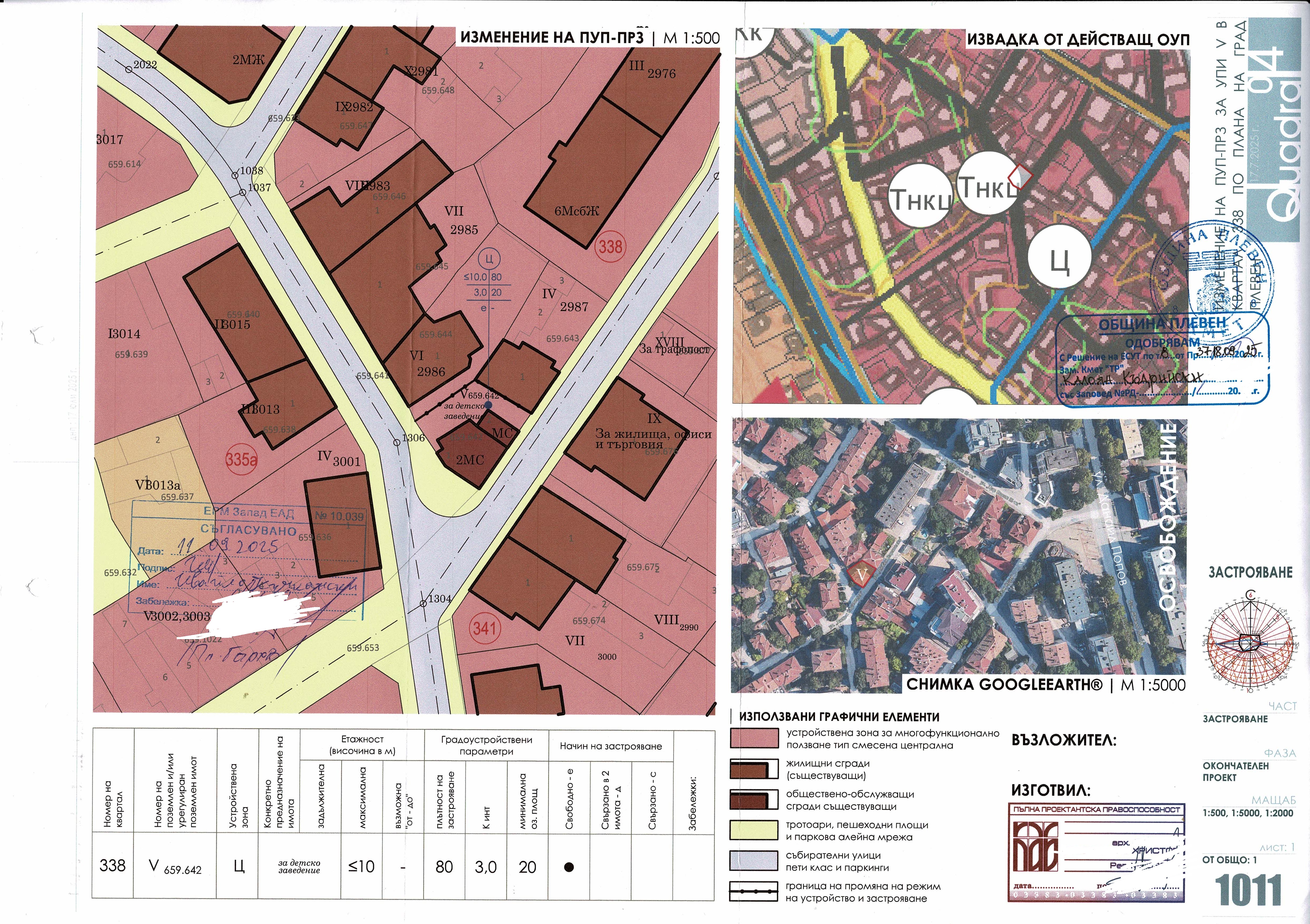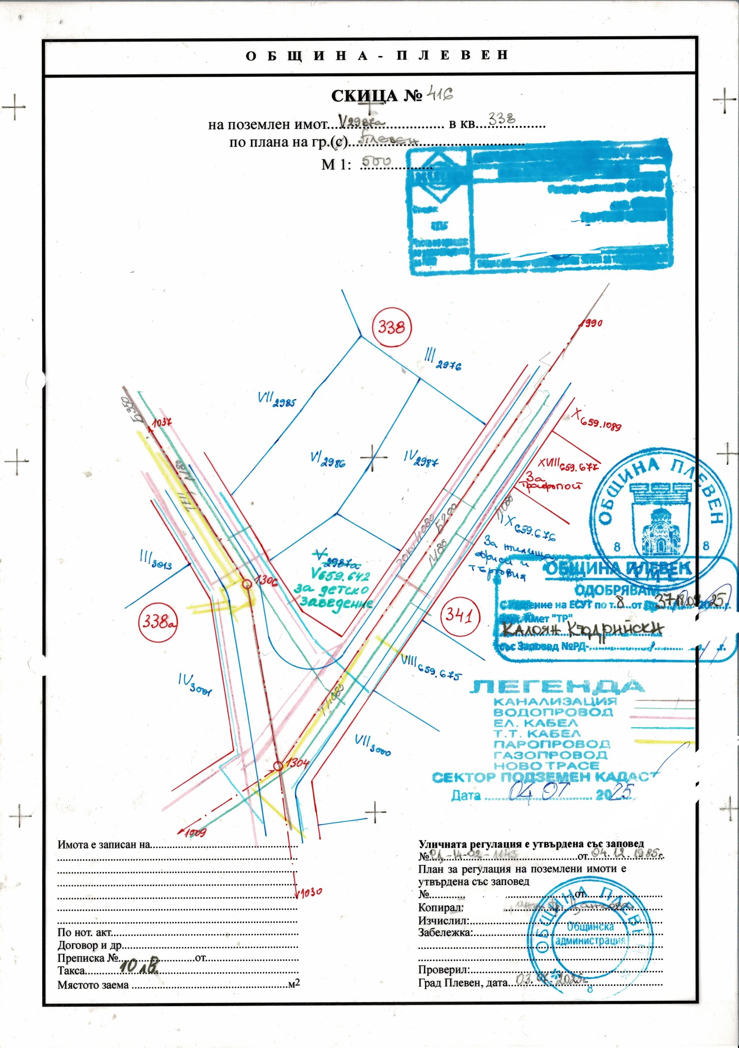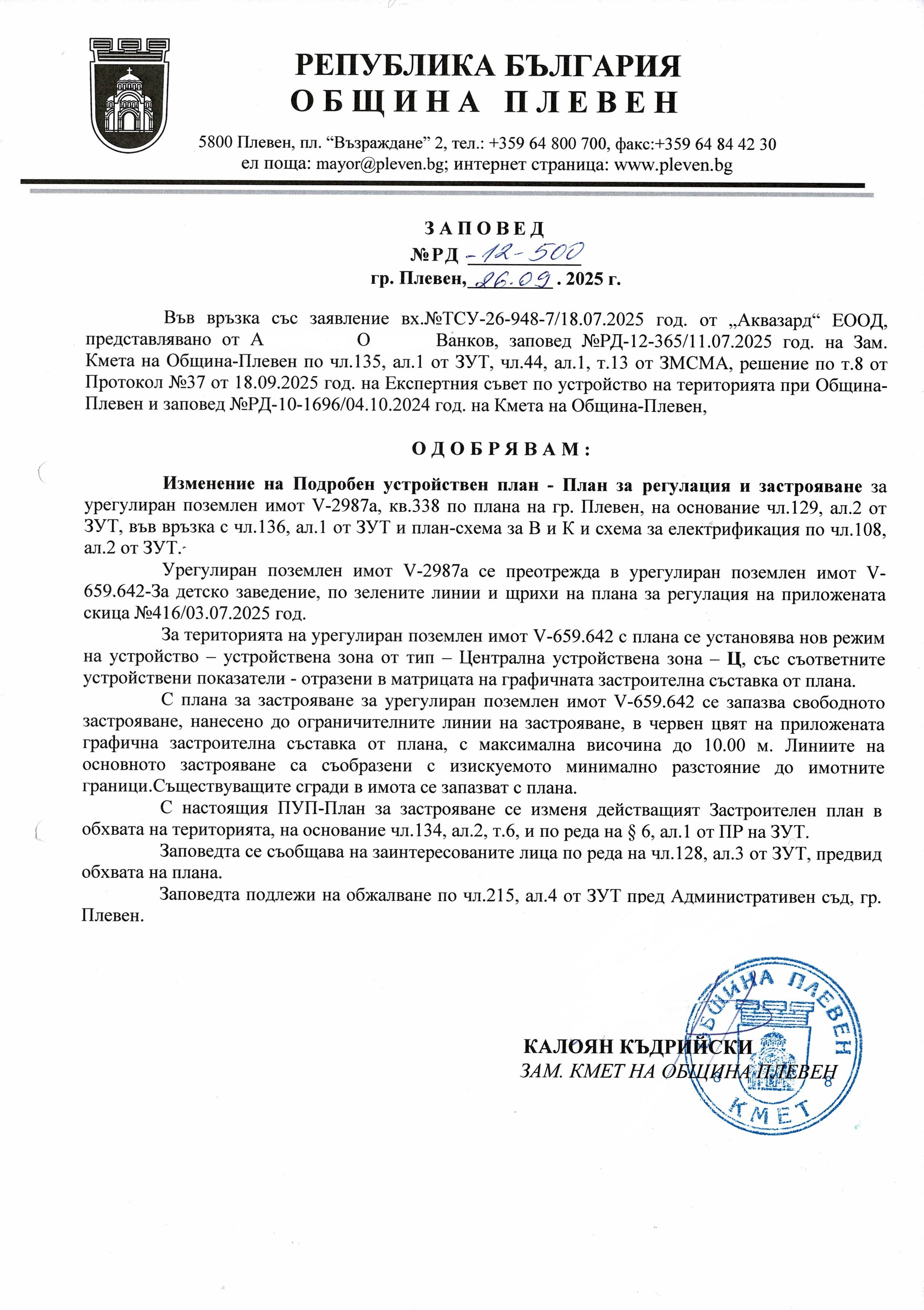 Община Плевен, на основание чл.129, ал.2 от Закона за устройство на територията съобщава, че със заповед № РД-12-500/26.09.2025г. е одобрен:
