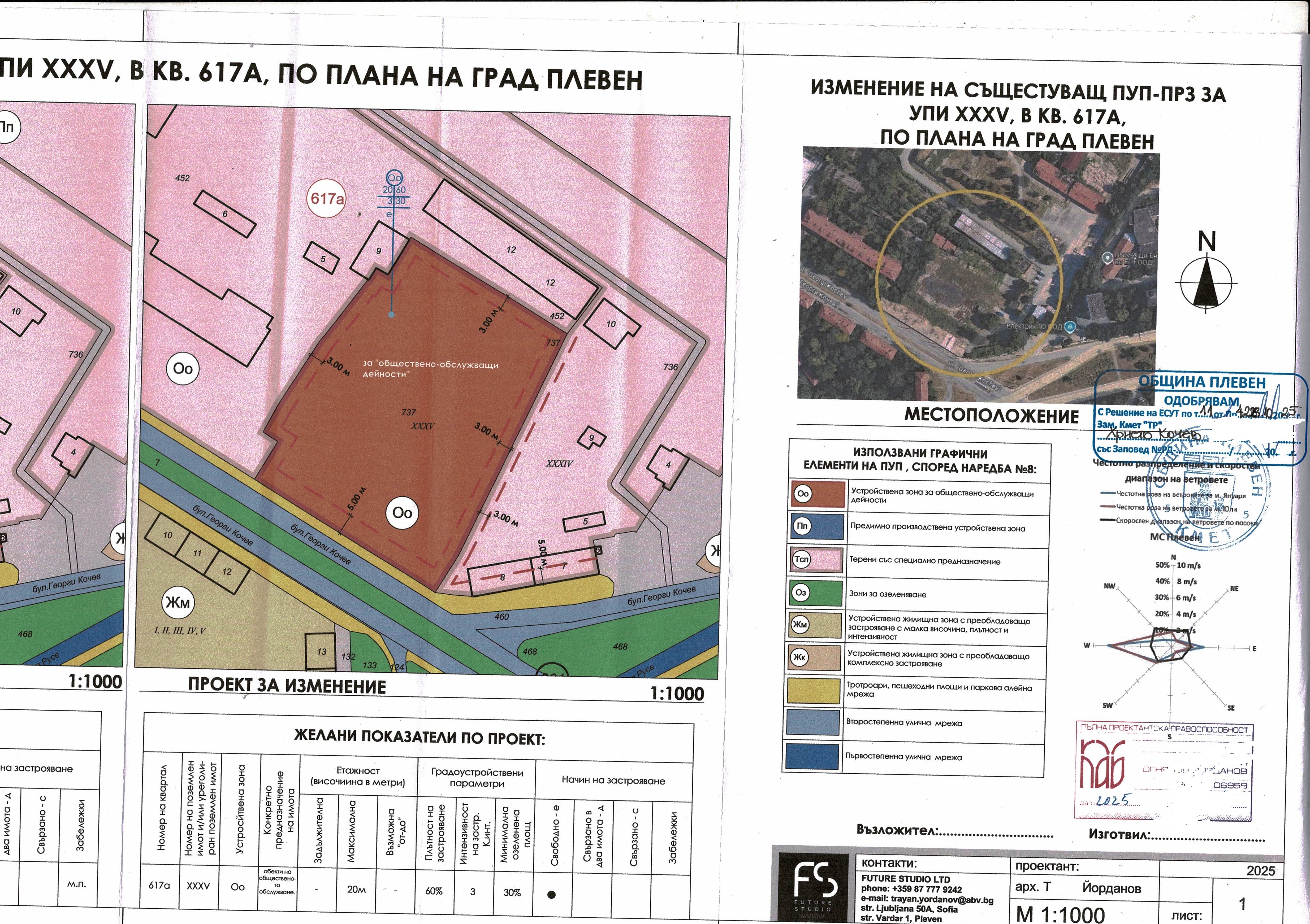 Подробен устройствен план - План за регулация и застрояване за УПИ XXXV-652.737 в кв.617а по плана на гр. Плевен, като част от Комплексен проект за инвестиционна инициатива за строеж: „Обществена сграда с търговски обекти, гаражи, паркиране и озеленен покрив” и Разрешение за строеж №385 от 06.11.2025г.
