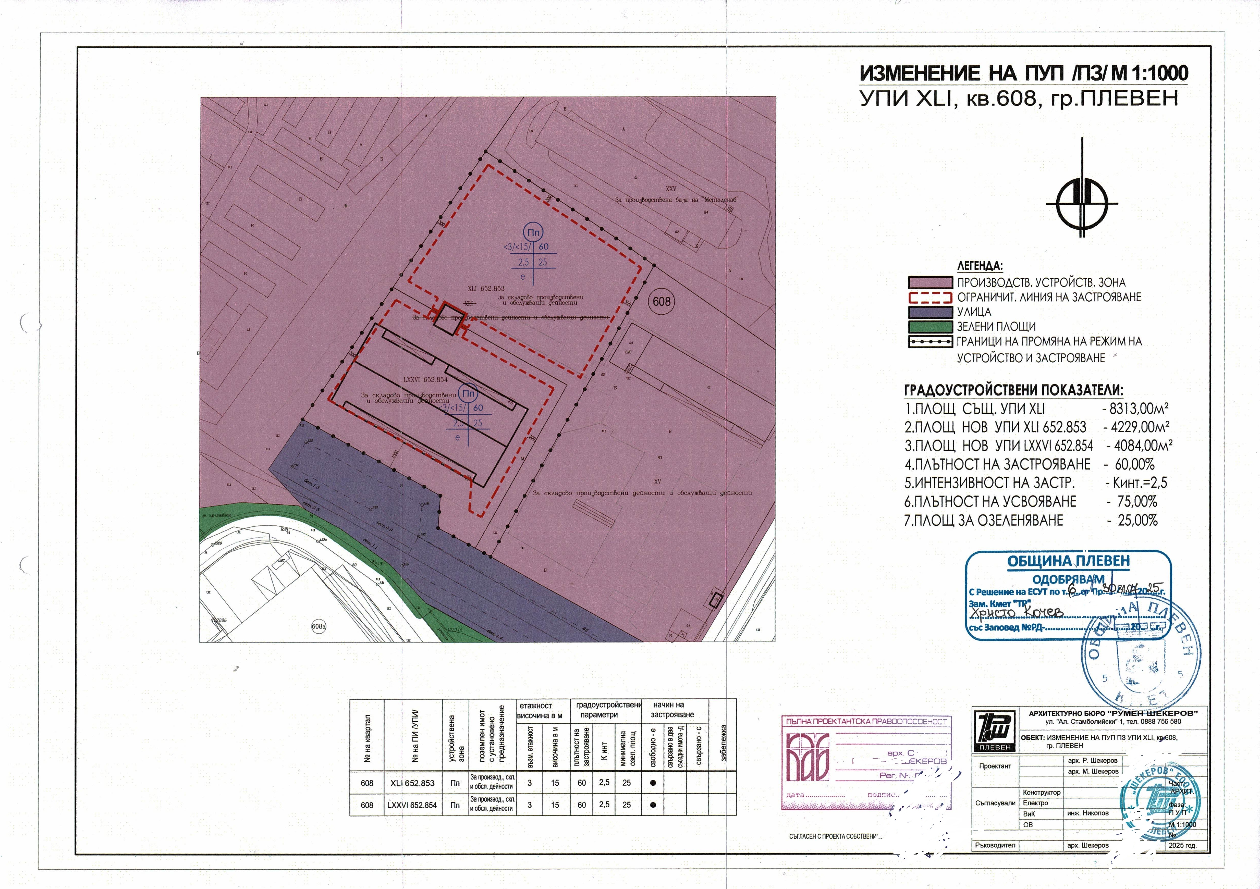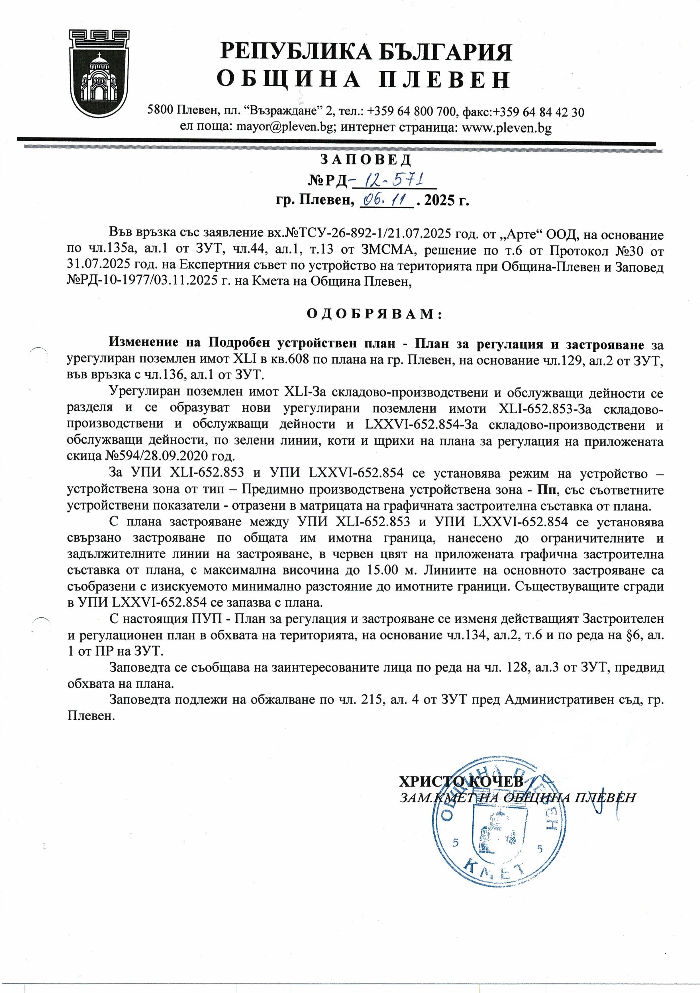 Община Плевен, на основание чл.129, ал.2 от Закона за устройство на територията съобщава, че със заповед № РД-12-571/06.11.2025г. е одобрен: