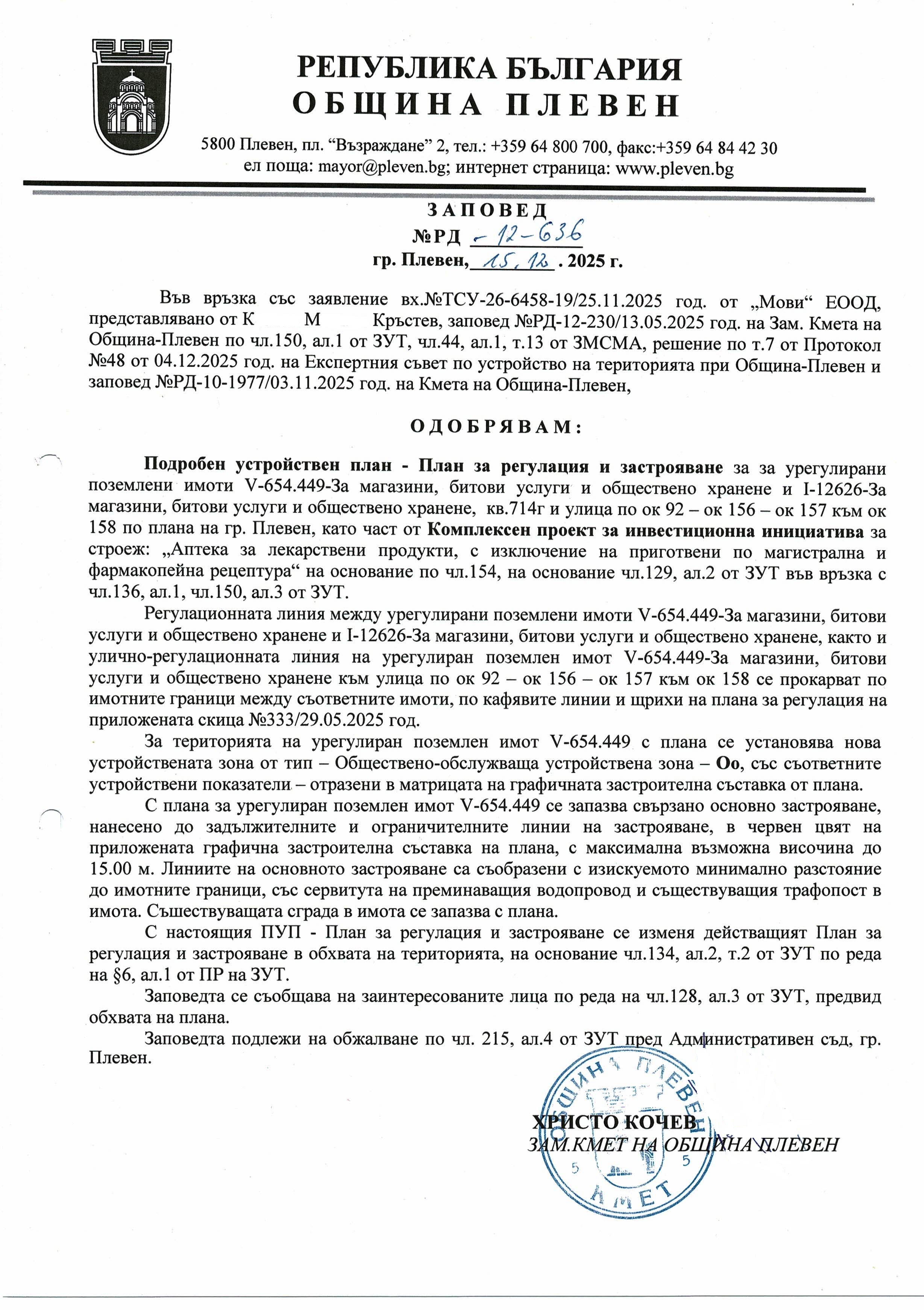 Подробен устройствен план- План за регулация и застрояване за УПИ V-654.449 За магазини, битови услуги и обществено хранене и I-12626 – За магазини, битови услуги и обществено хранене, кв.714 г и улица по ок 92- ок 156 – ок 157 към ок 158 по плана на гр. Плевен, като част от Комплексен проект за инвестиционна инициатива -проекти и Разрешение за строеж №456/15.12.2025г. за обект: „АПТЕКА ЗА ЛЕКАРСТВЕНИ ПРОДУКТИ, с изключение на приготвяни по магистрална и фармакопейна рецептура”