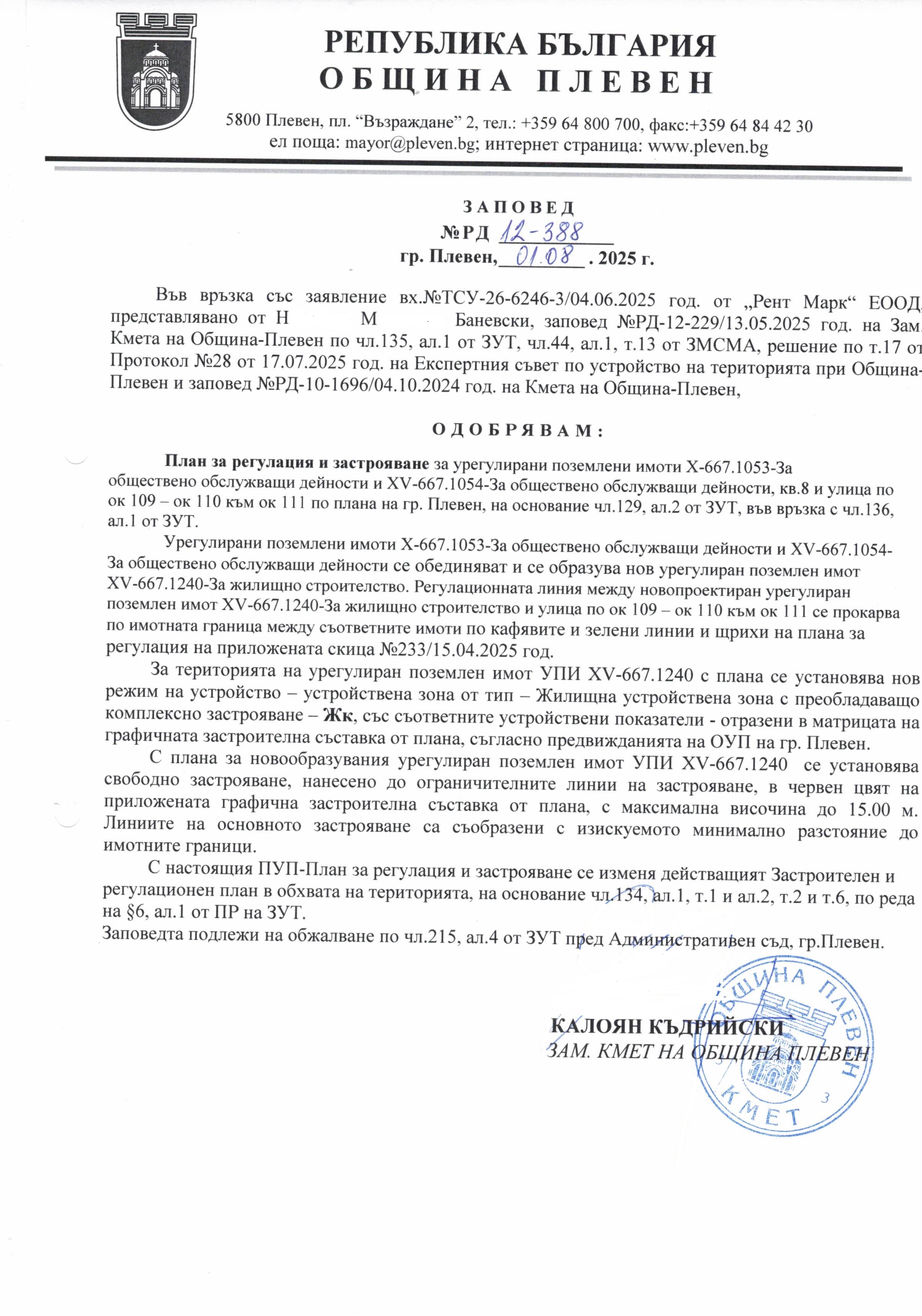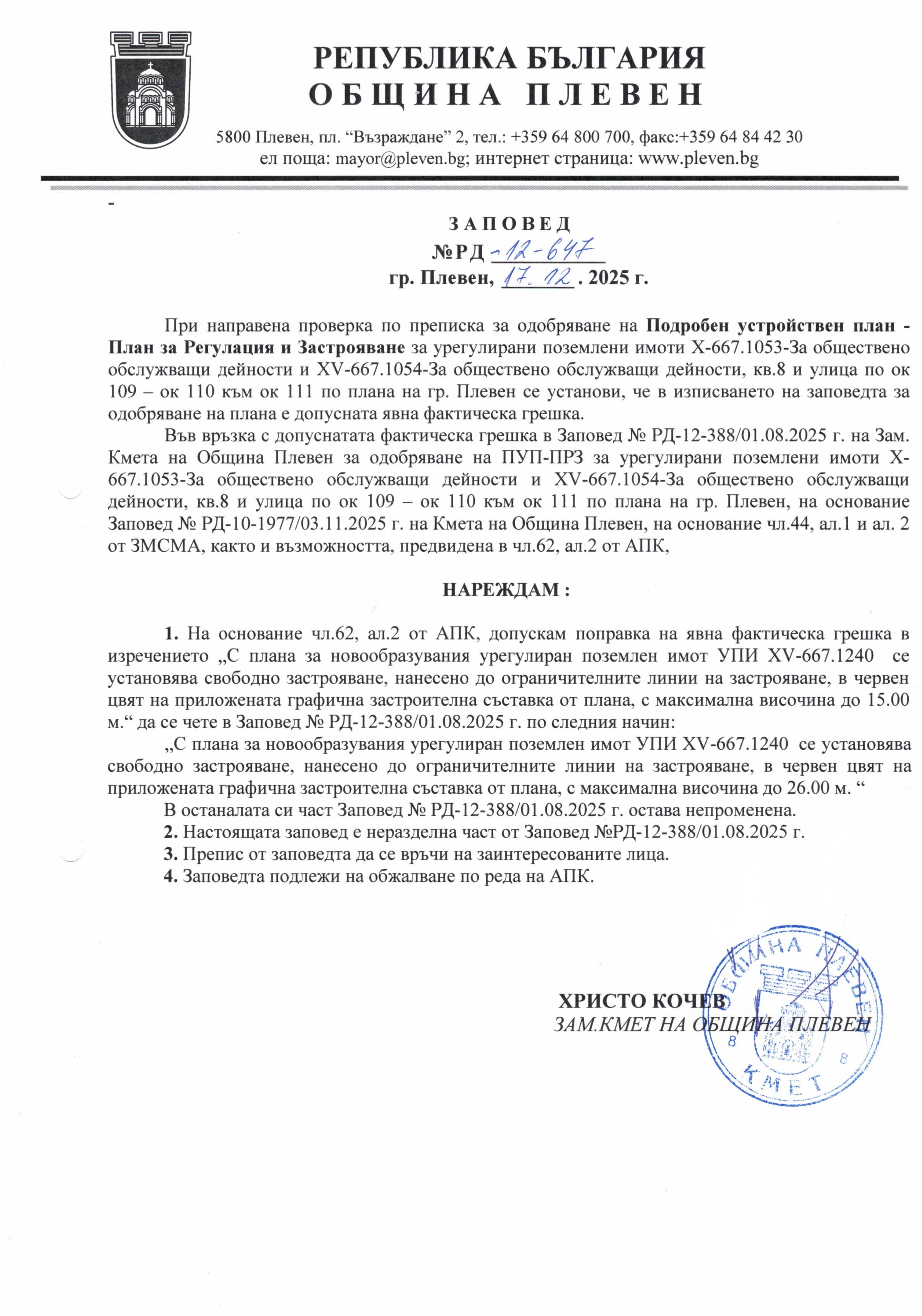 Община Плевен, на основание чл. 129, ал.2 от Закона за устройство на територията и на основание чл. 62, ал. 2 от АПК със заповед № РД-12-647 от 17.12.2025г. за поправка на явна фактическа грешка на заповед № РД 12-388 от 01.08.2025г. на Кмета на Община Плевен е одобрен