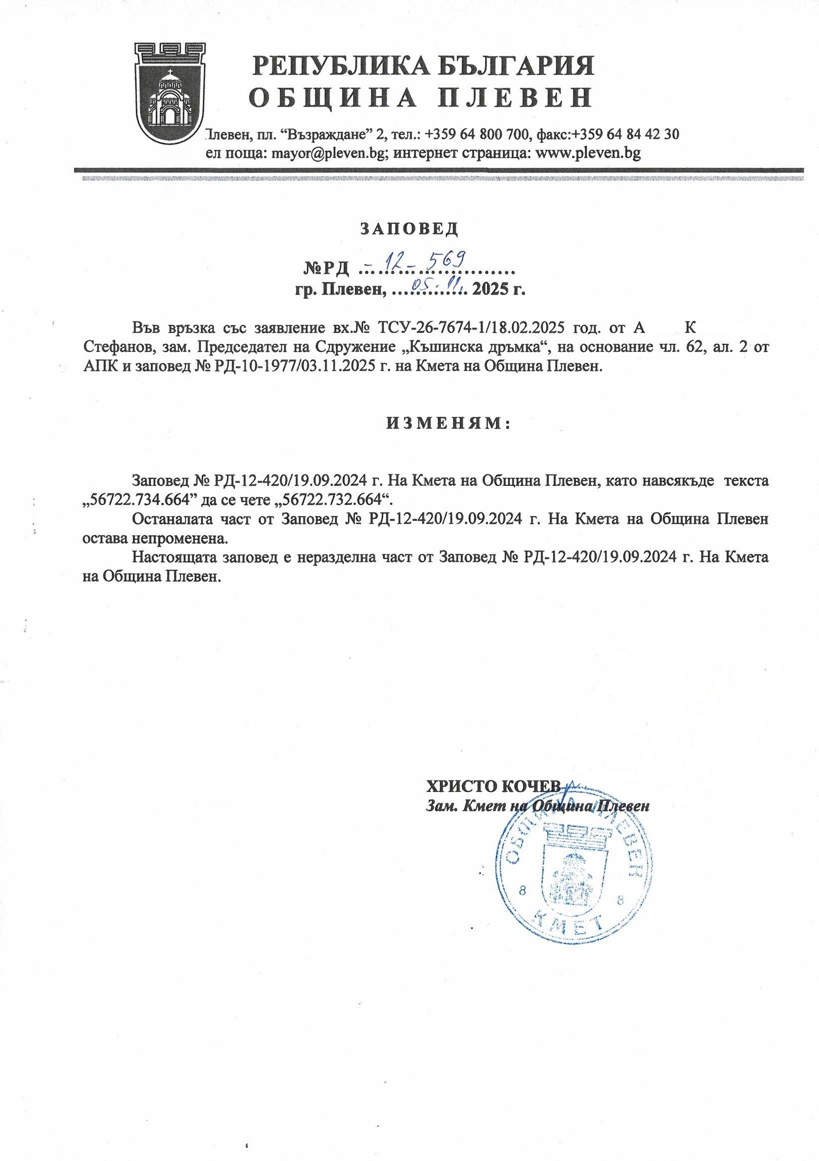 Община Плевен, на основание на чл.62, ал.2 от АПК съобщава, че със Заповед № РД-12-569/05.11.2025 г. на Зам. Кмета на Община Плевен и заповед № РД-10-1977/03.11.2025 г. на Кмет на Община Плевен се изменя Заповед № РД-12-420-/19.09.2024 г. на Кмет на Община Плевен, като навсякъде текста „56722.734.664“ да се чете „56722.732.664“, като в останалата част заповедта остава непроменена в
