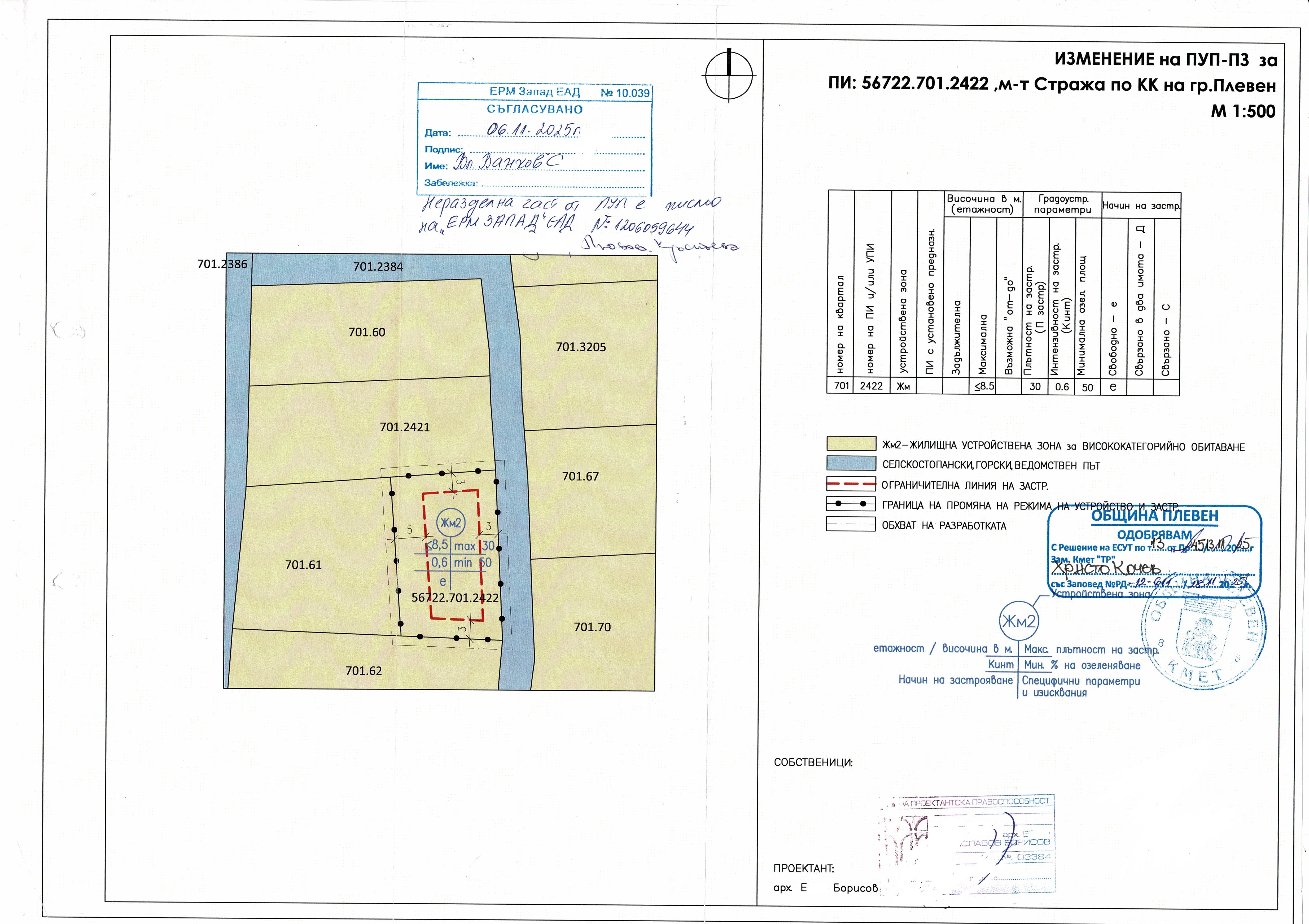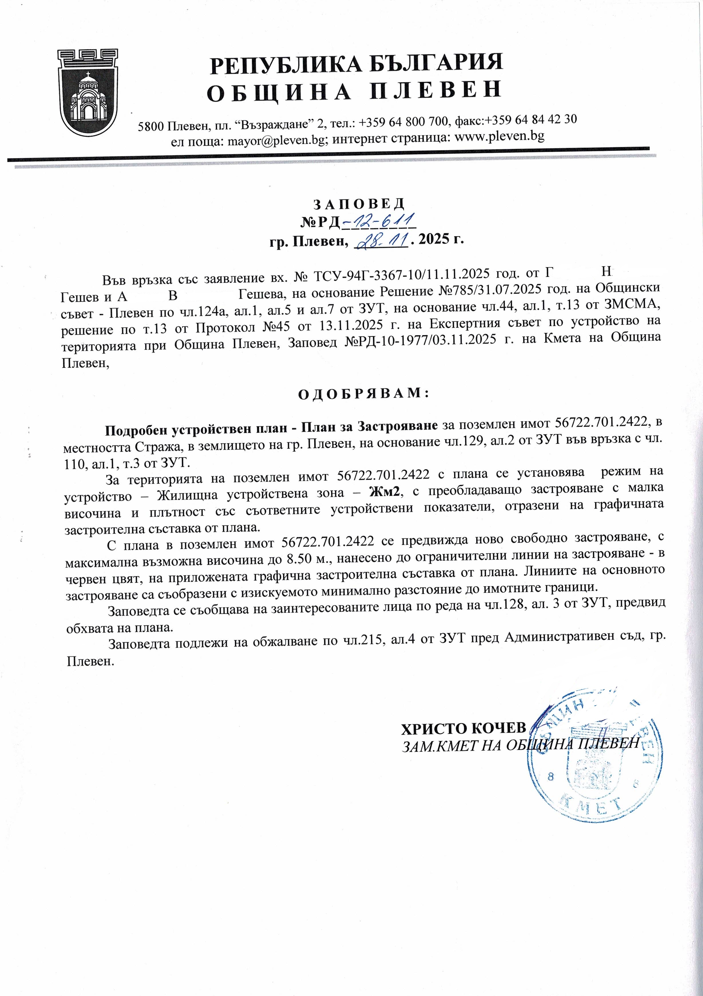 Община Плевен, на основание чл.129, ал.2 от Закона за устройство на територията, съобщава, че със Заповед №РД-12 – 611 от 28.11.2025 год. на Зам. Кмета на Община Плевен е одобрен: