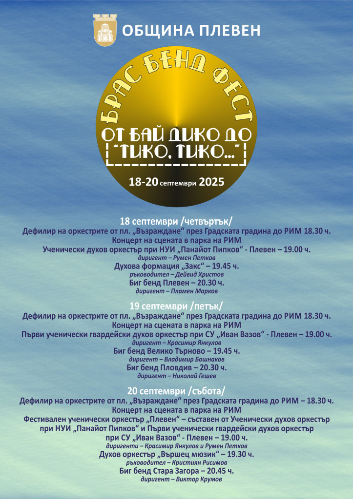 Духови оркестри от страната ще се представят в Плевен в петото издание на Брас Бенд фест „От бай Дико до „Тико, тико…“ вторник, 16 септември 2025 517