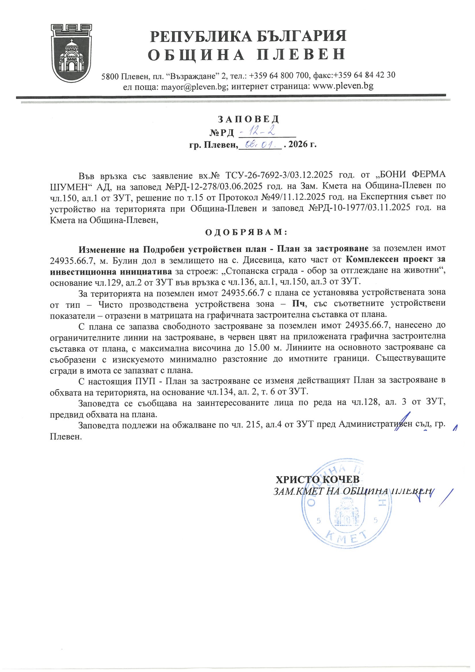 О Б Я В Л Е Н И Е № ТСУ-30-1978-2/08.01.2026 г. четвъртък, 08 януари 2026 55 Файлове: Заповед КПИИ м. Булин дол с_. Дисевица стр_.1_.jpg ПУП-ПЗ м. Булин дол с_. Дисевица стр_.2_.jpg ПУП-ПЗ м. Булин дол с_. Дисевица стр_.3_.jpg ПУП-ПЗ м. Булин дол с_. Дисевица стр_.1_.jpg