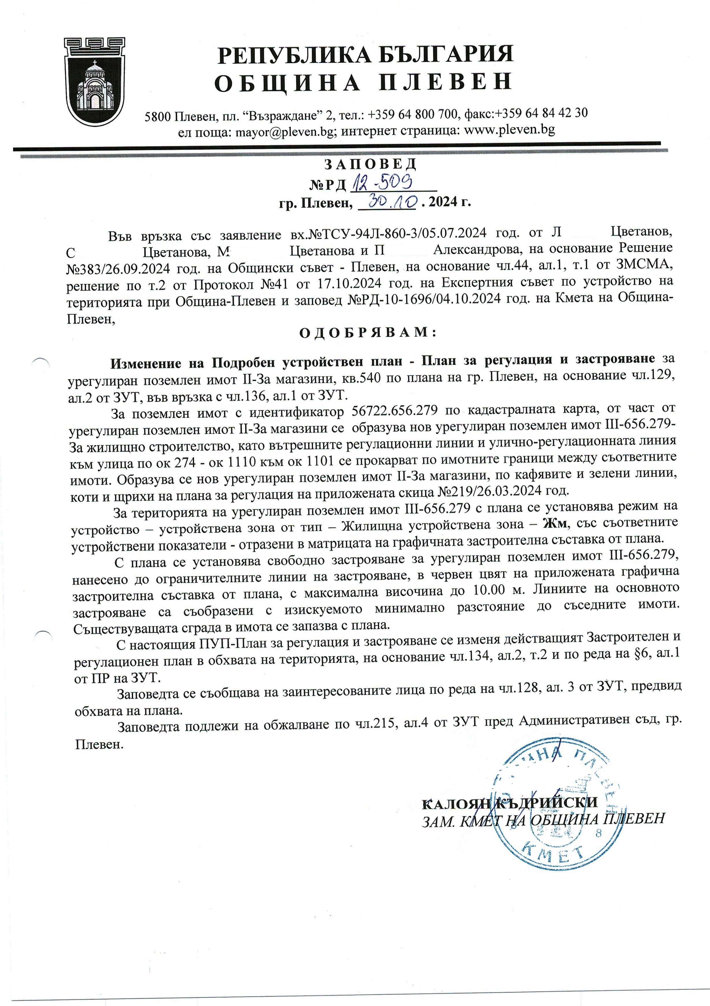 ОБЯВЛЕНИЕ №ТСУ-30-1867-1 гр. Плевен, 31.10.2024г. четвъртък, 31 октомври 2024 611 Файлове: Регулационна скица, кв.540_.jpg ПУП-План за регулация и застрояване, кв.540_.jpg Заповед, кв.540_.jpg