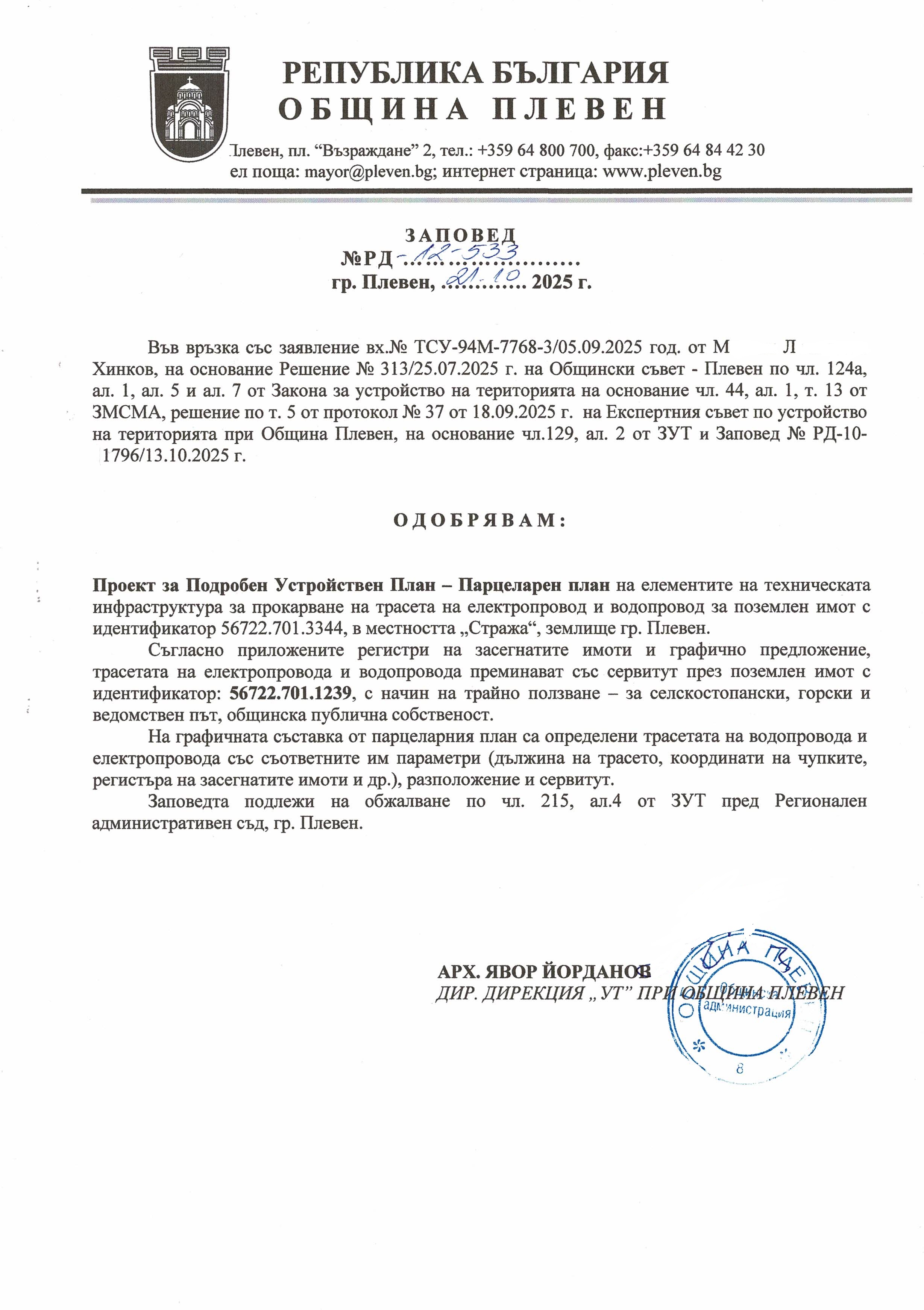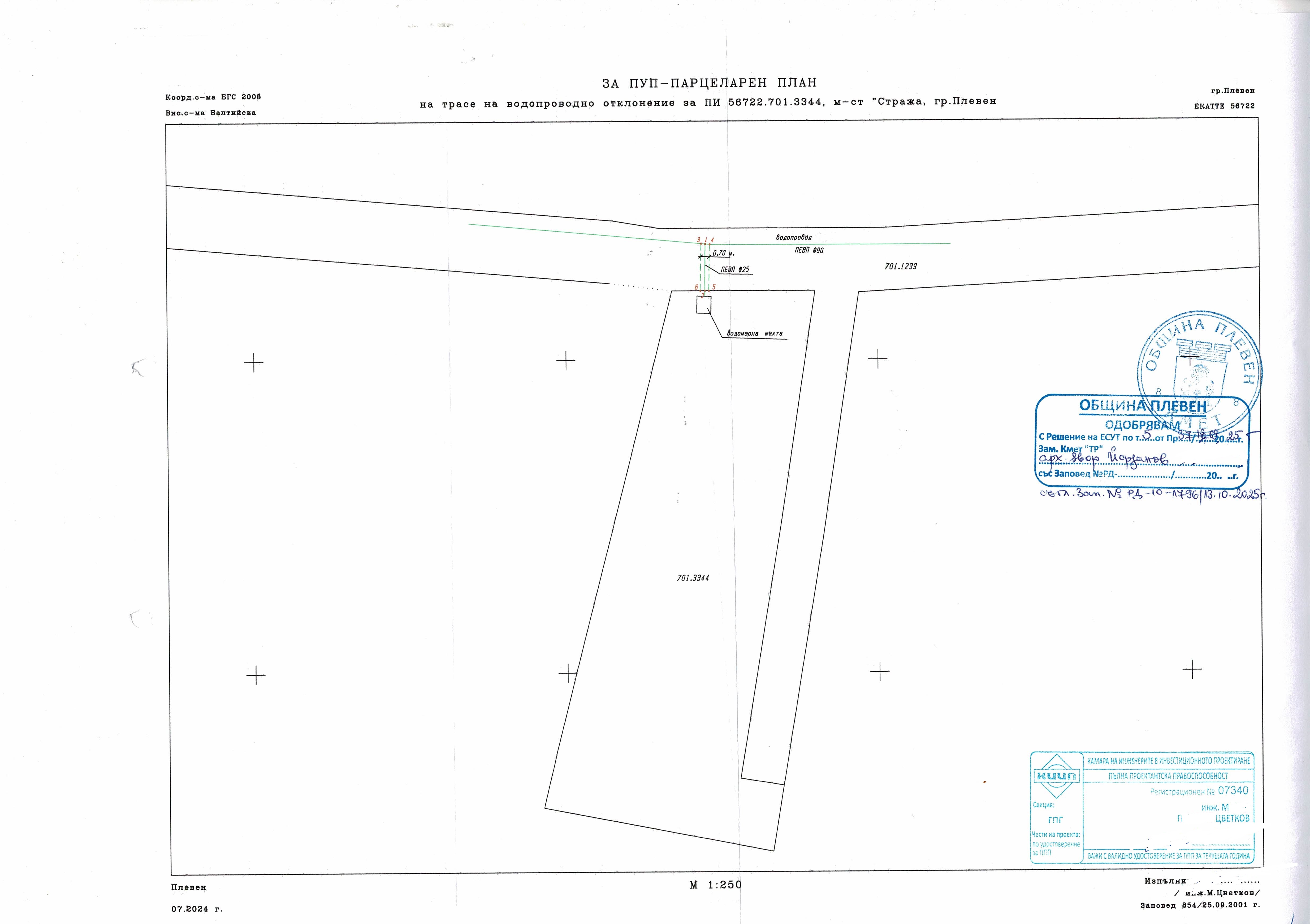 ОБЯВЛЕНИЕ №ТСУ–30-1978-292 гр. Плевен, 22.10.2025год. сряда, 22 октомври 2025 129 Файлове: ПУП-Парцеларен план.jpg Трасировъчен план.jpg Заповед, ПИ 701.3344_.jpg