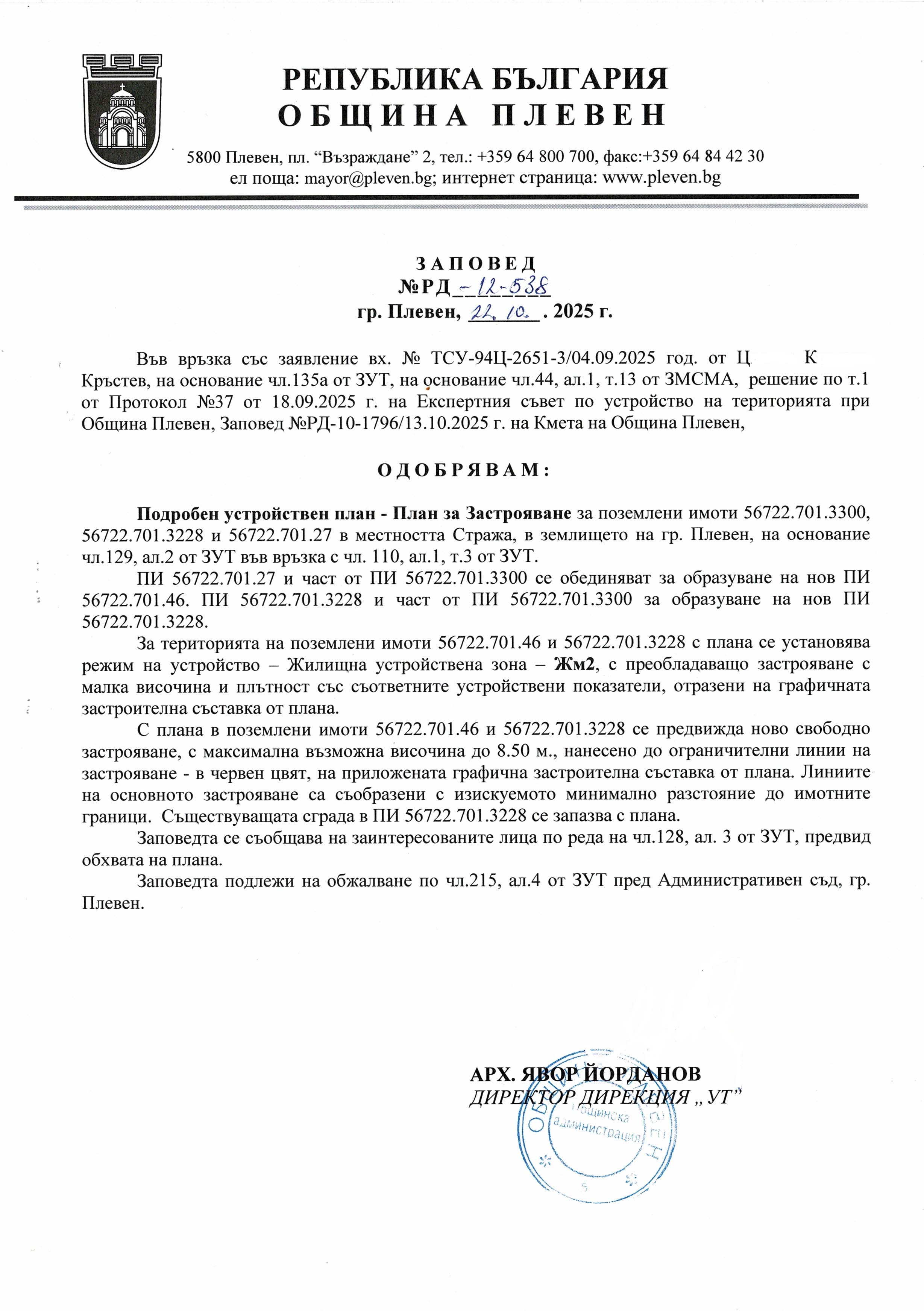 ОБЯВЛЕНИЕ №ТСУ–30–1978-297 гр. Плевен, 23.10.2025год. петък, 24 октомври 2025 80 Файлове: ПУП-План за застрояване, ПИ 701.3300, _._._._._.jpg Заповед, ПИ 701.3300, _._._._.jpg