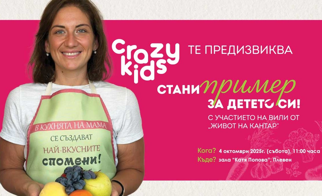 Вдъхновяващо и полезно за деца и родители благотворително събитие под мотото „Стани пример за детето си!“ ще се проведе в Плевен на 4 октомври, събота, от 11.00 часа в зала „Катя Попова“. Инициативата е на „Crazy Kids“ и е подкрепена от Община Плевен. Специални гости ще бъдат: Вили Христова - участник в „Живот на кантар“ и Анна Сапунджиева – победител във формата, Райко Цолов - треньор на деца с наднормено тегло, Ивелина Боиклиева - нутриционист и експерт по балансирано хранене, Веселина Асенова - психолог. Организаторите обещават и много изненади.