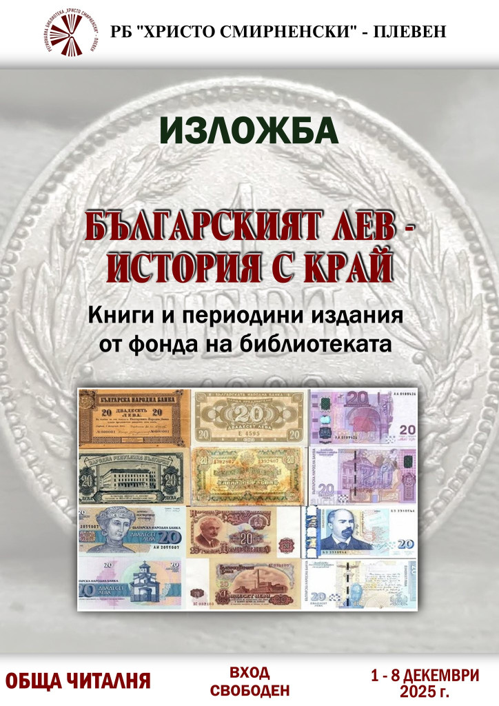 От 1 до 8 декември (понеделник до понеделник) - изложба „Българският лев - история с край”. Изложбата е по повод 6 декември - Денят на банкера, както и във връзка с приемането на европейската валута от 1 януари 2026 г. Ще видите и експозиция на книги и периодични издания от фонда на библиотеката. Ще научите за банкнотите с женски образи, къде и кога е отпечатана първата българска банкнота, кой е първият български владетел, чийто лик се появява приживе върху банкнота, за фалшификацията на 15 млн. през 1925 г. на така наречените „ботевки” и т. н. Място - Обща читалня на РБ „Хр. Смирненски”;