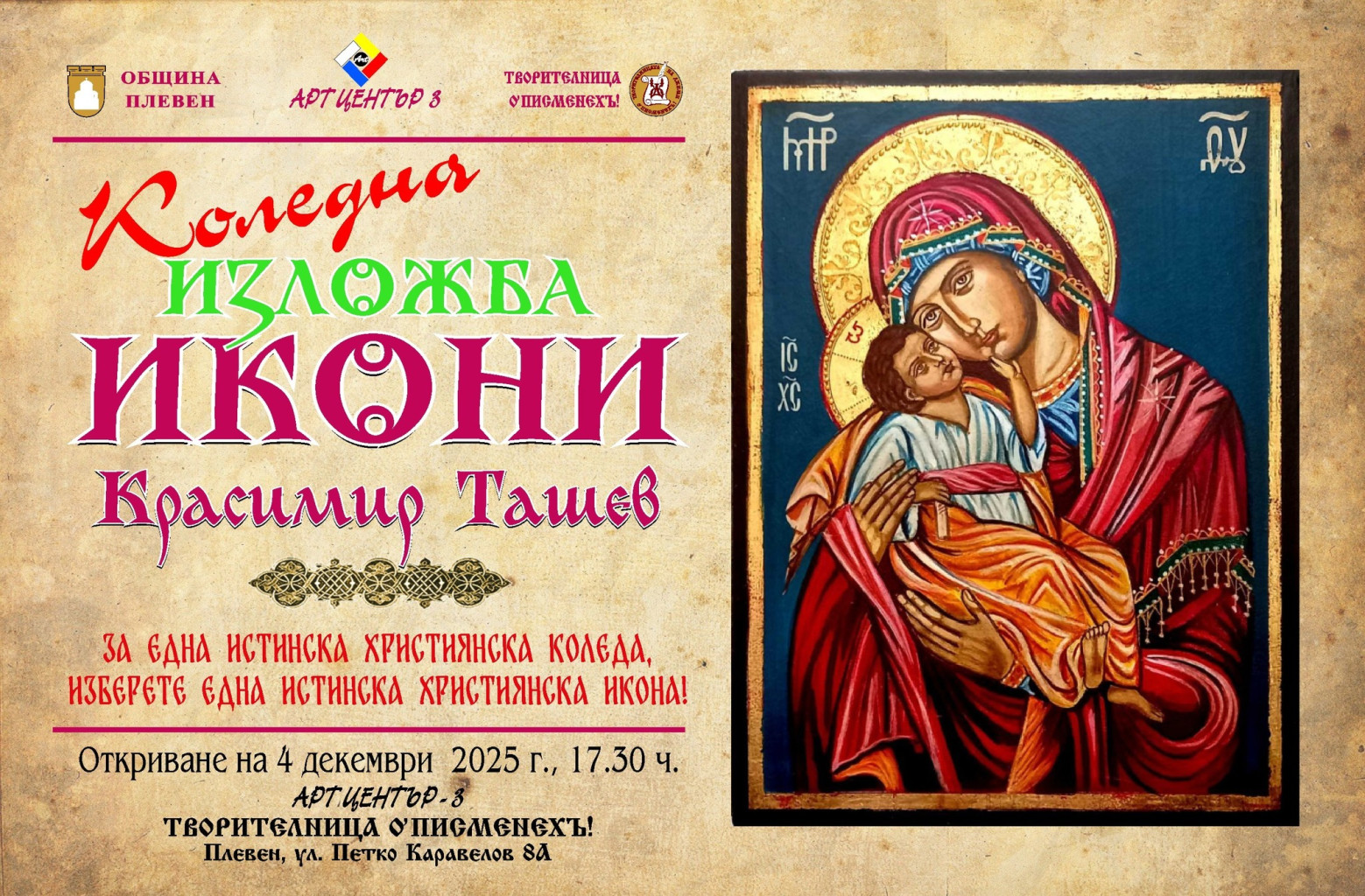 4 декември (четвъртък) – коледна изложба икони, изографисани по класическа технология от плевенския иконописец Красимир Ташев. Ще може да направите избор измежду повече от 40 православни икони, рисувани през тази година. Откриване - 17.30 часа.
