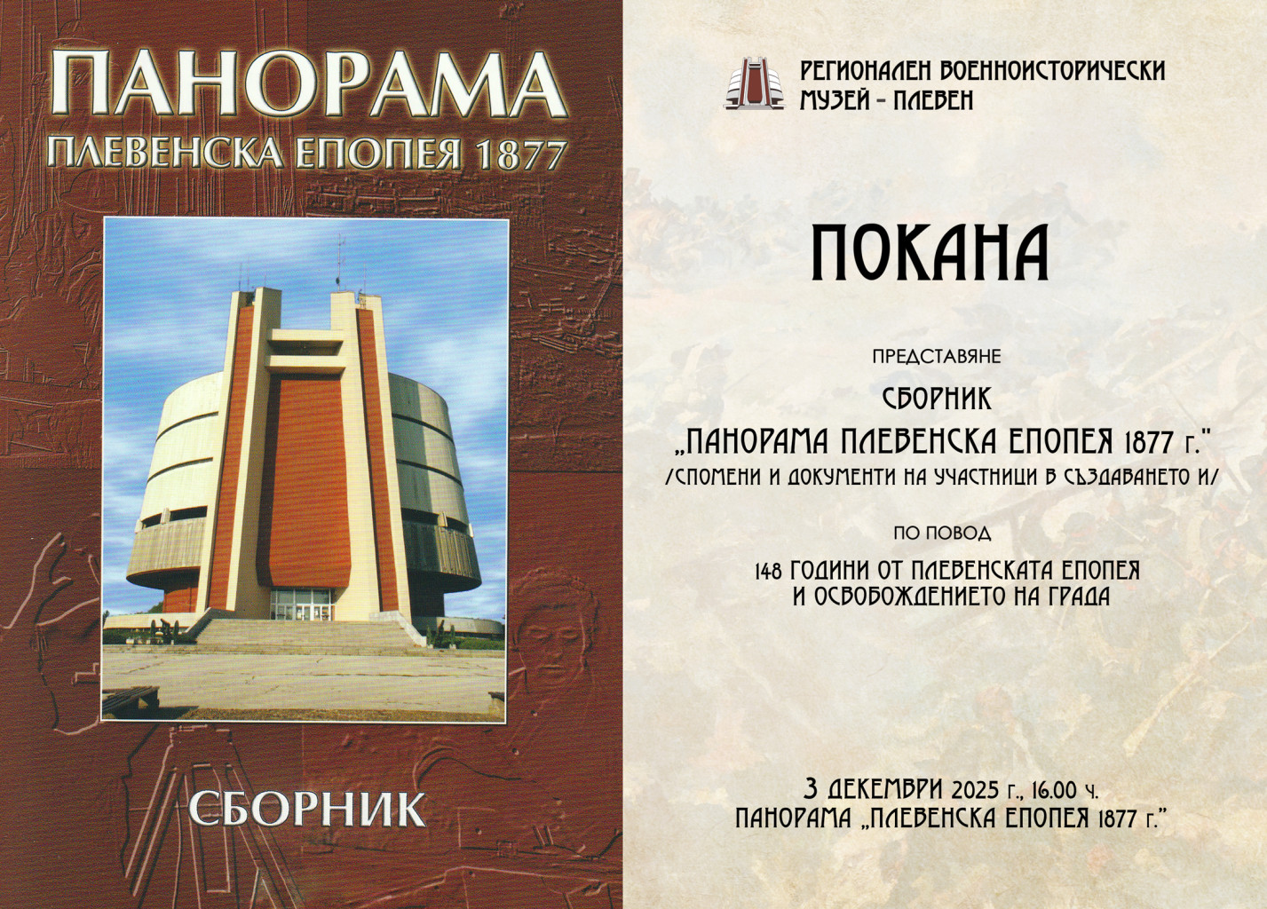 3 декември (сряда) - По повод 10 декември и 148 години от Освобождението на Плевен, РВИМ - Плевен ще представи Сборник „Панорама „Плевенска епопея 1877“ - Спомени и документи на участници в създаването ѝ, както и филм за изграждането на Панорамата. Ще присъстват участници в строителството на Панорамата. Начало - 16.00 часа.