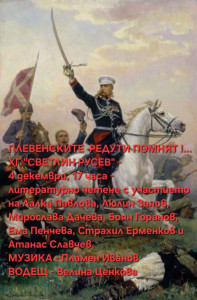 4 декември ( четвъртък) - „Плевенските редути помнят!...“ - литературно четена на Сдружение „Дружество на писателите“, посветено на 10 декември - Освобождението на Плевен. Участват: Лалка Павлова, Люлин Занов, Мирослава Дачева, Боян Горанов, Ема Пенчева, Страхил Ерменков и Атанас Славчев. Водещ - Велина Ценкова. Музикален съпровод - Пламен Иванов. Начало – 17.00 часа;