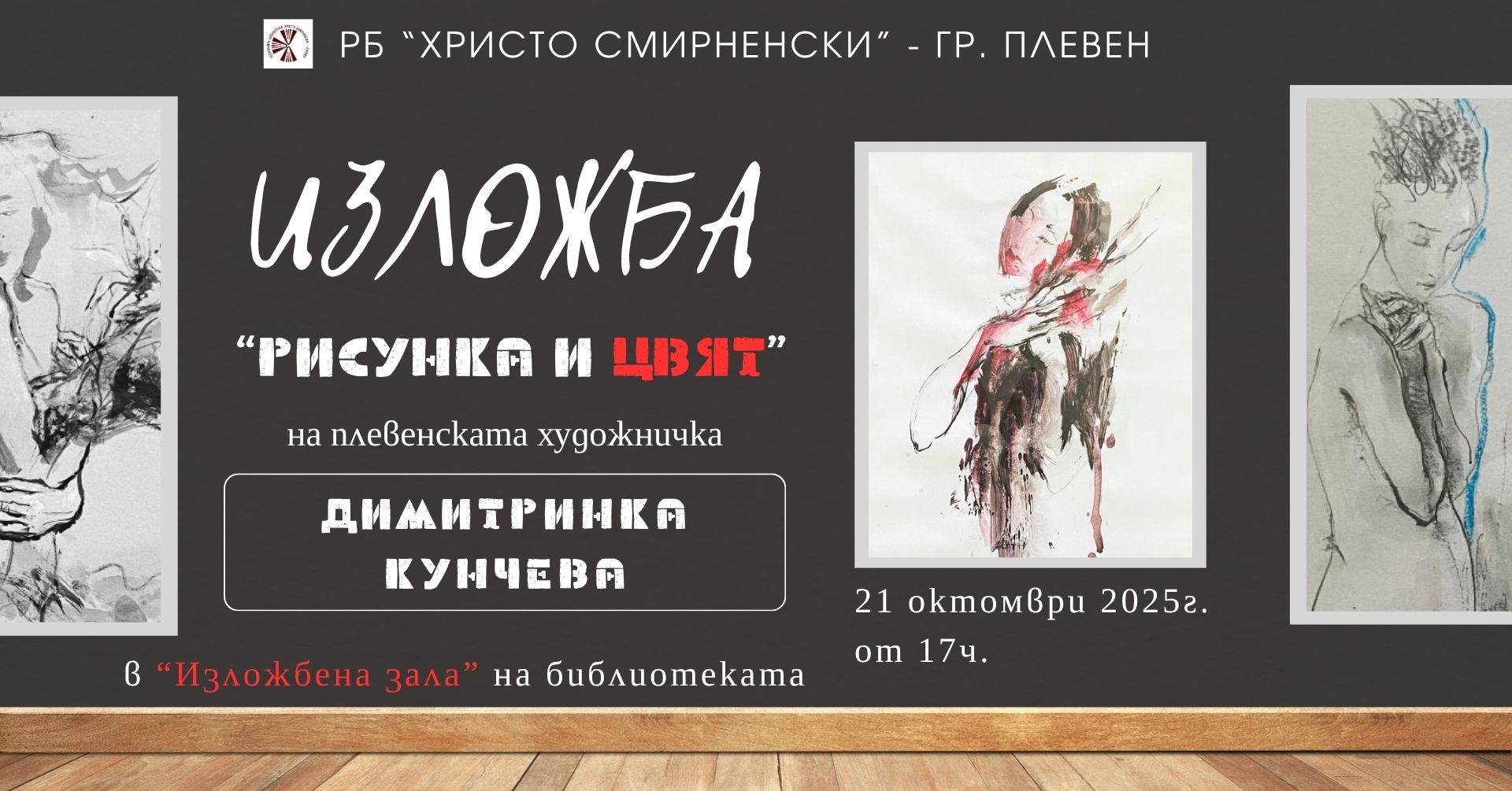 21 октомври (вторник) - изложба „Рисунка и цвят“ на плевенската художничка Димитринка Кунчева. Член е на представителството на СБХ в Плевен. Работи в областта на традиционното и дигиталното изкуство, като темите са разнообразни, с преобладаващо фигуративно присъствие. Има реализирани няколко самостоятелни изложби в България, както и многобройни участия в съвместни арт проекти. Вход свободен. Място - изложбена зала, начало – 17.00 часа.
