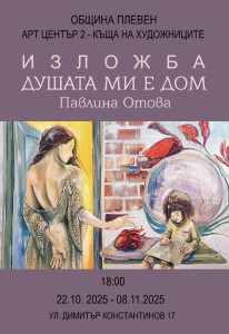 22 октомври (сряда) – изложба „Душата ми е дом“ на художничката Павлина Отова. Творбите ще може да разгледате в галерията до 8 ноември. Откриване – 18.00 часа.