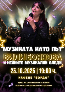 23 октомври (четвъртък) - втора дата за музикалната вечер „Музиката като път“ с Вили Боянова. Гласът ѝ носи спомени, а присъствието ѝ - вдъхновение. На тази вечер тя няма да е сама, до нея застават нейните възпитаници – млади таланти, които носят частица от нейния дух и музикална философия. Начало – 19.00 часа;