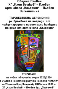 21 октомври (вторник) – с откриване на изложба „Маски“ и връчване на награди плевенската арт школа „Колорит“ ще открие новия творчески сезон. Изложбата е с рисунки на децата от школата, подготвени за участие в международни конкурси в Япония и Китай. Началото на творческия сезон 2025/2026 ще бъде отпразнувано и с връчване на близо 300 отличия на децата от школата, спечелени от тях през последните пет месеца от национални и международни конкурси в Индия, Япония, Израел, Франция, Словения, Италия и България. Начало – 18.00 часа.