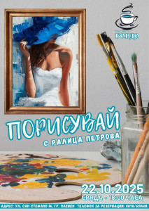 22 октомври (сряда) - „Порисувай“ с Ралица Петрова - в света на живописта - без очаквания, без граници, само с вдъхновение и топлина. вечер, в която четката води, а душата следва, независимо дали държиш четка за първи път или рисуваш със сърцето си от години. С потвърждаване за участие до 21 октомври. Начало – 18.00 часа;