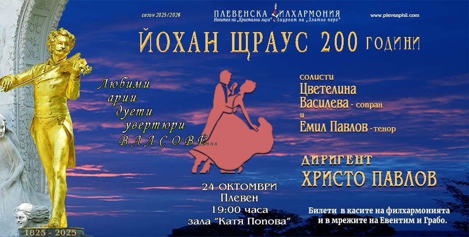 24 октомври (петък) – Плевенска филхармония със специална програма за 200 години от рождението на Йохан Щраус. Солисти: Цветелина Василева – сопран, и Емил Павлов – тенор. Диригент: маестро Христо Павлов. В програмата: любими арии, дуети, увертюри, валсове от Йохан Щраус. Начало – 19.00 часа.