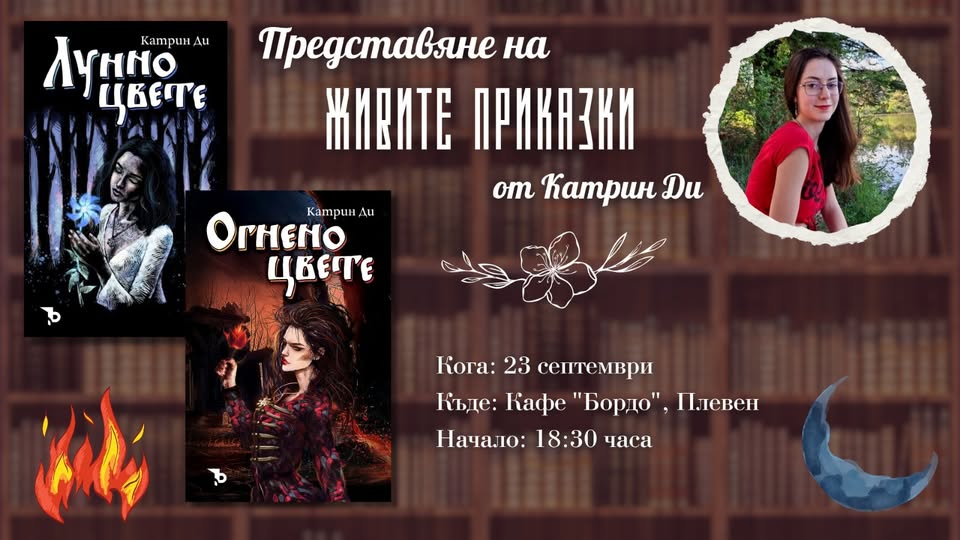 23 септември (вторник) - Представяне на дилогията „Живите приказки“ на Катрин Ди чрез аудио-визуално преживяване, с което зрителите ще се потопят в света на митовете и легендите. „Живите приказки“ е приключенска етно-фентъзи поредица, чието действие се развива в наши дни. Романите са вдъхновени от славяно-българската митология, приказки и легенди, свързани с реални места като Еленино езеро, Плиска, Самодивските (Кралевите) езера, Созопол и др. Начало – 18:30 часа.