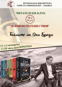 27 ноември (четвъртък) - създаване на нов Читателски клуб „Книжни пътешествия“. Първата среща е посветена на един от най-популярните съвременни автори - Дан Браун. Срещата е озаглавена „Тайните на Дан Браун“ и ще включва представяне и обсъждане на романите му. Изборът на автора не е случаен – преди броени дни излезе на български език най-новият му роман „Тайната на тайните“. Място - зала Игротека. Начало – 17.30 часа. Входът е свободен.