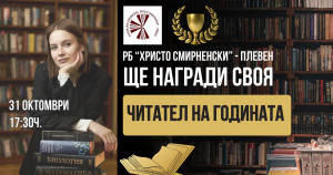 На 31 октомври 2025 г., петък, в навечерието на Деня на народните будители в библиотеката ще отличат Читател на годината. В класирането участва всеки регистриран читател, който се е проявил с най-много заети и прочетени книги, редовност в посещенията, културно и отговорно поведение, активност в инициативите на библиотеката. За победителя ще има специална награда и признание от библиотеката. Инициативата има за цел да почете хората, които с любов към четенето, постоянство и културно отношение превръщат библиотеката в живо средище на знание и вдъхновение. Начало – 17.30 часа.