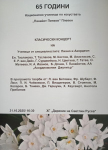 31 октомври (петък) - Класически концерт по повод 65 години от основаването на НУИ „Панайот Пипков“ – Плевен. Начало - 16.30 часа;