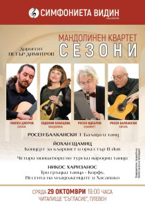 29 октомври (сряда) – концерт на Симфониета Видин и Мандолинен квартет „Сезони“. Ще чуете изпълненията на Милен Джуров – китара, Евдокия Бобоцова – мандолина, Росен Идеалов – кларинет, Росен Балкански – китара. Диригент – Петър Димитров. В програмата: Росен Балкански I – Балада и танц; Йохан Щамиц – концерт за кларинет и оркестър B dur; Четири миниатюри по турски народни танци; Никос Харизанос – Три гръцки танца – Корфу, Песента на младоженците и Хасапико. Място - зала „Емил Димитров“, начало - 19.00 часа.