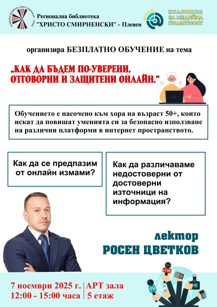 7 ноември (петък) - безплатно обучение на тема „Как да бъдем по-уверени, отговорни и защитени онлайн“ организира Коалиция за медийна грамотност. Лектор на събитието ще бъде Росен Цветков, български разследващ журналист и репортер. Лекцията е насочена към хора на възраст 50+, които искат да развиват и надграждат уменията си за безопасно и пълноценно използване на различните комуникационни канали, и платформи в интернет пространството. Обучението е подходящо и за всеки извън формалното образование, който има интерес към темата. Инициативата е от 12.00 до 15.00 часа. Място – арт залата на петия етаж на библиотеката.