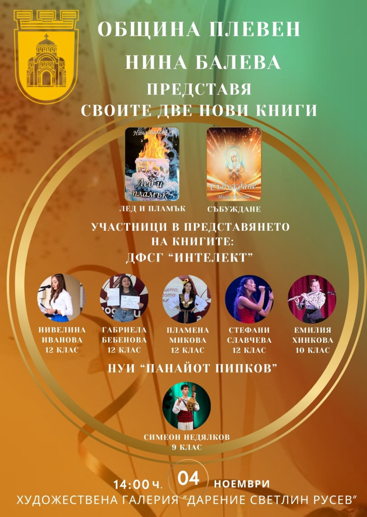 4 ноември (вторник) - Представяне на книгите „Лед и пламък“ и „Събуждане“ на Нина Балева. В представянето участват ученици от ДФСГ „Интелект“ и НУИ „П. Пипков“, Плевен. Начало - 14.00 часа;