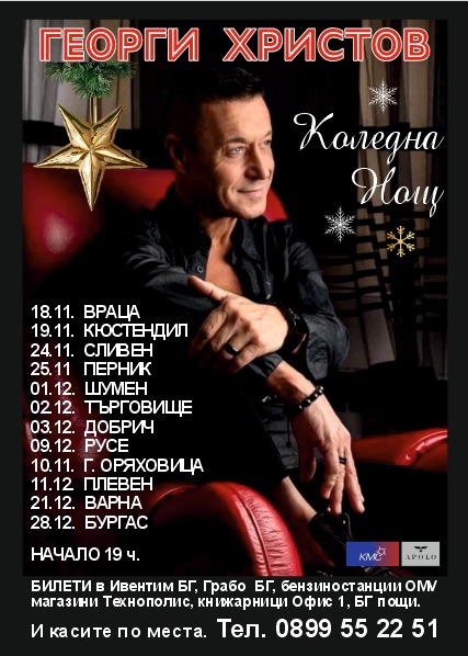 11 декември (четвъртък) – Коледен концерт на великия глас на България – Георги Христов. Той е ненадминат творец – композитор, актьор и изключителен певец, чийто мощен и кристален тенор оставя дълбока следа във всяко изпълнение. Ще чуете както любимите вечни хитове, така и най-новите песни от албума му, излязъл през 2024-25 година. Начало – 19.00 часа.