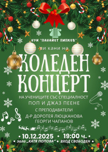 10 декември (сряда) - Коледен концерт на учениците от специалност поп и джаз пеене от НУИ „Панайот Пипков“ с ръководители д-р Доротея Люцканова и Георги Чапанов. Джазът ще се преплете с попа, празничните мелодии ще се превърнат в истории, няма да бъде просто концерт, а празник на младостта, вдъхновението и силата на изкуството да обединява. Входът е свободен. Начало – 19.00 часа;