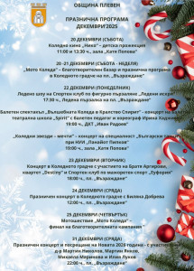 Община Плевен е подготвила празничен афиш със забавления за малки и големи и кани всички жители и гости на града да споделят празничната атмосфера в най-светлия месец от годината.