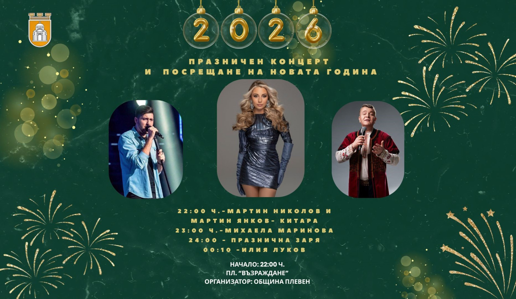 С концерт на младата и талантлива поп-звезда Михаела Маринова и народния певец Илия Луков, Плевен ще изпрати старата и ще посрещне Новата година. Празничното събитие, организирано от Община Плевен на площад „Възраждане“, ще започне в 22.00 часа, когато на сцената ще се качат и музикалните звезди д-р Мартин Николов и китаристът Мартин Янков. Водещ на новогодишната нощ ще бъде актьорът от плевенския Драматично-куклен театър Иван Жунтовски.
