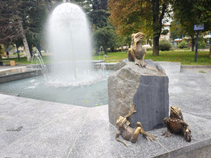 Емблематичната скулптурна композиция с жабките при Водната каскада в центъра на Плевен отново радва и малки, и големи - днес третата жабка бе стабилно укрепена на своето място и е част от веселата компания на останалите две.