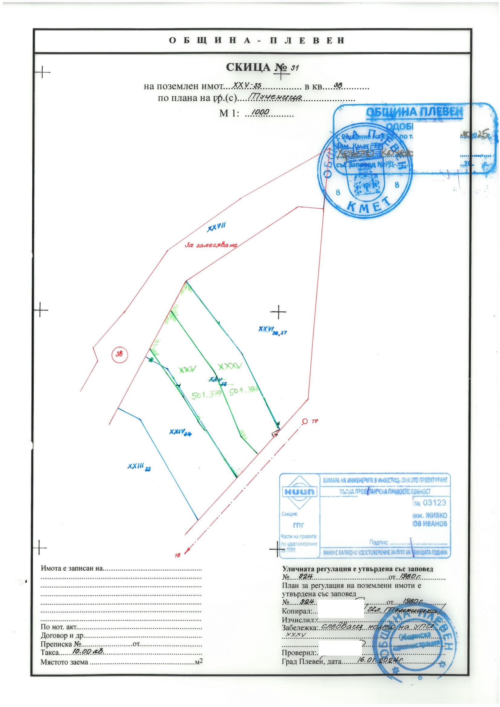 Община Плевен, на основание чл.129, ал.2 от Закона за устройство на територията съобщава, че със заповед № РД-12-586/13.11.2025 г. на Зам. кмет на Община Плевен е одобрен проект за изменение на: