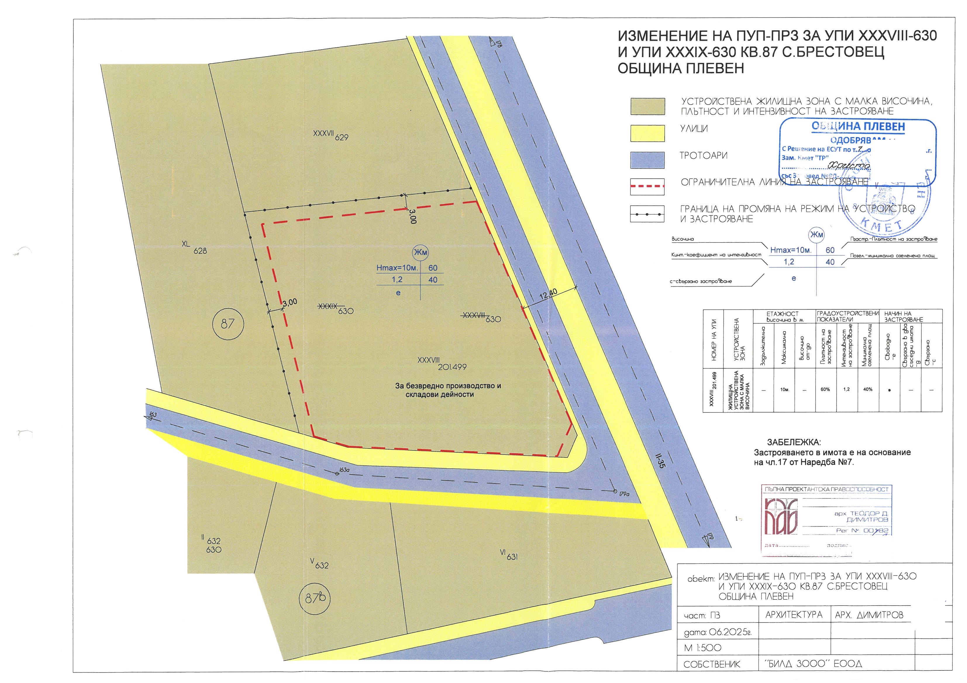Изменение на Подробен устройствен план - План за регулация и застрояване за урегулирани поземлени имоти ХХХVIII-630 и XXXIX-630 в кв. 87 по плана на с. Брестовец, общ.Плевен, на основание чл.129, ал.2 от ЗУТ във връзка с чл.136, ал.1 от ЗУТ,